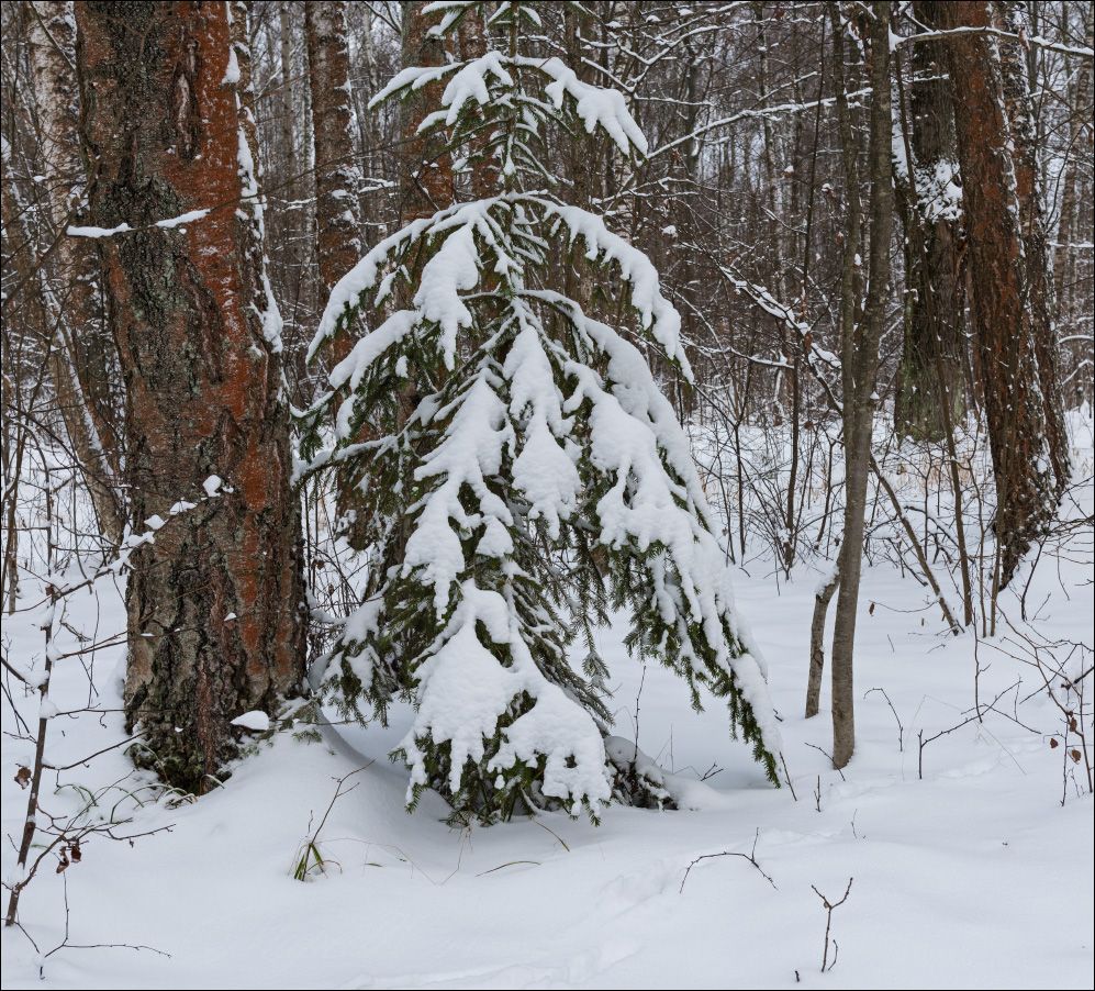 И всё же, героиня здесь- ёлочка. У каждой свой характер. На первом снимке-стеснительная, за берёзку прячется, на втором, словно красна -девица выступает, на восьмом-подросток , запуталась в ветках, на десятом- под тяжестью снега к берёзе прислонилась. Все хороши по своему, нет только лживых и злых.Отличная серия!