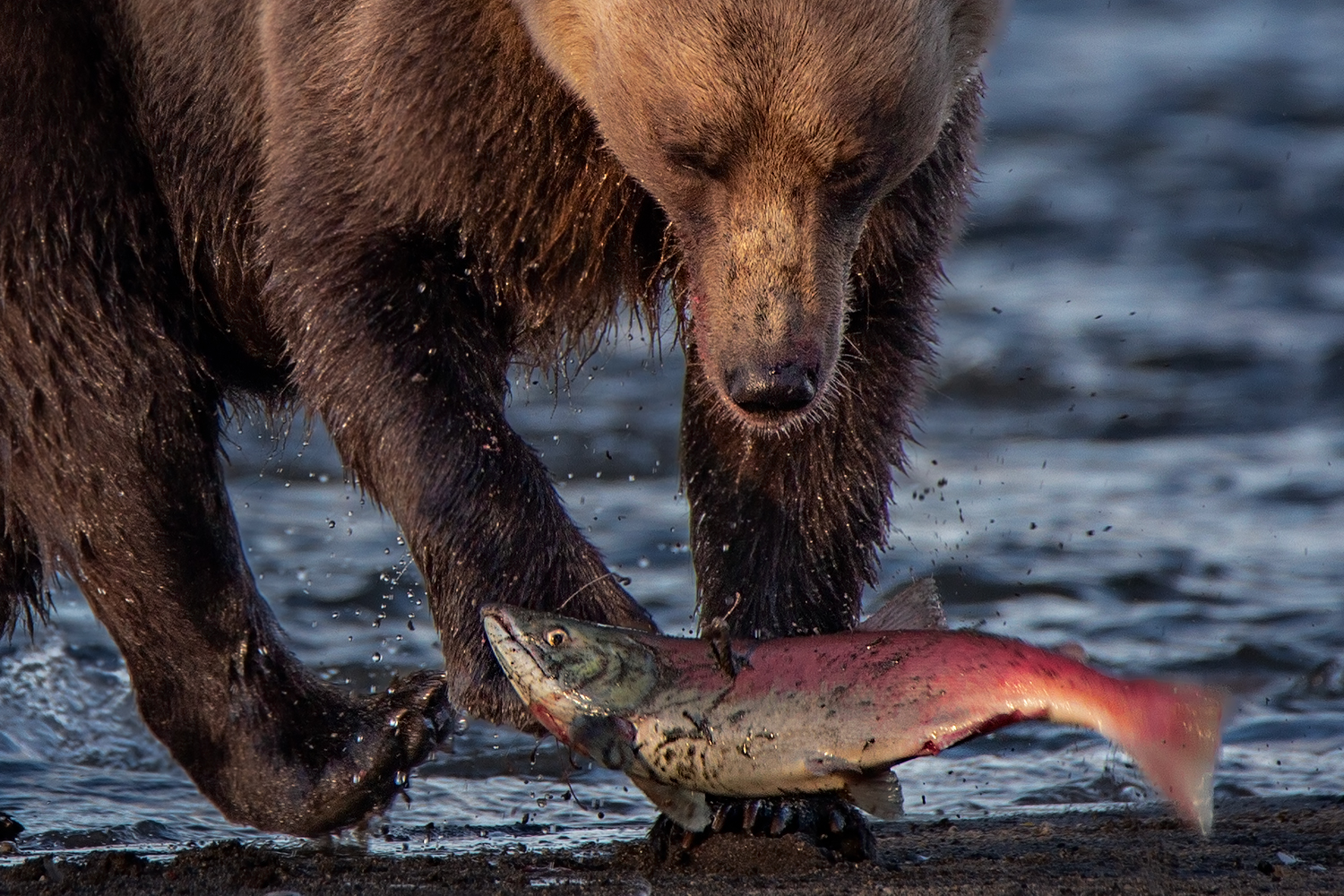 На фоне бурлящей реки Камчатки крупный бурый медведь с силой хватает добычу — свежего лосося. Момент напряжённой охоты запечатлён фотографом Денисом Будьковым, демонстрируя баланс дикой природы и инстинкт выживания в естественной среде обитания.