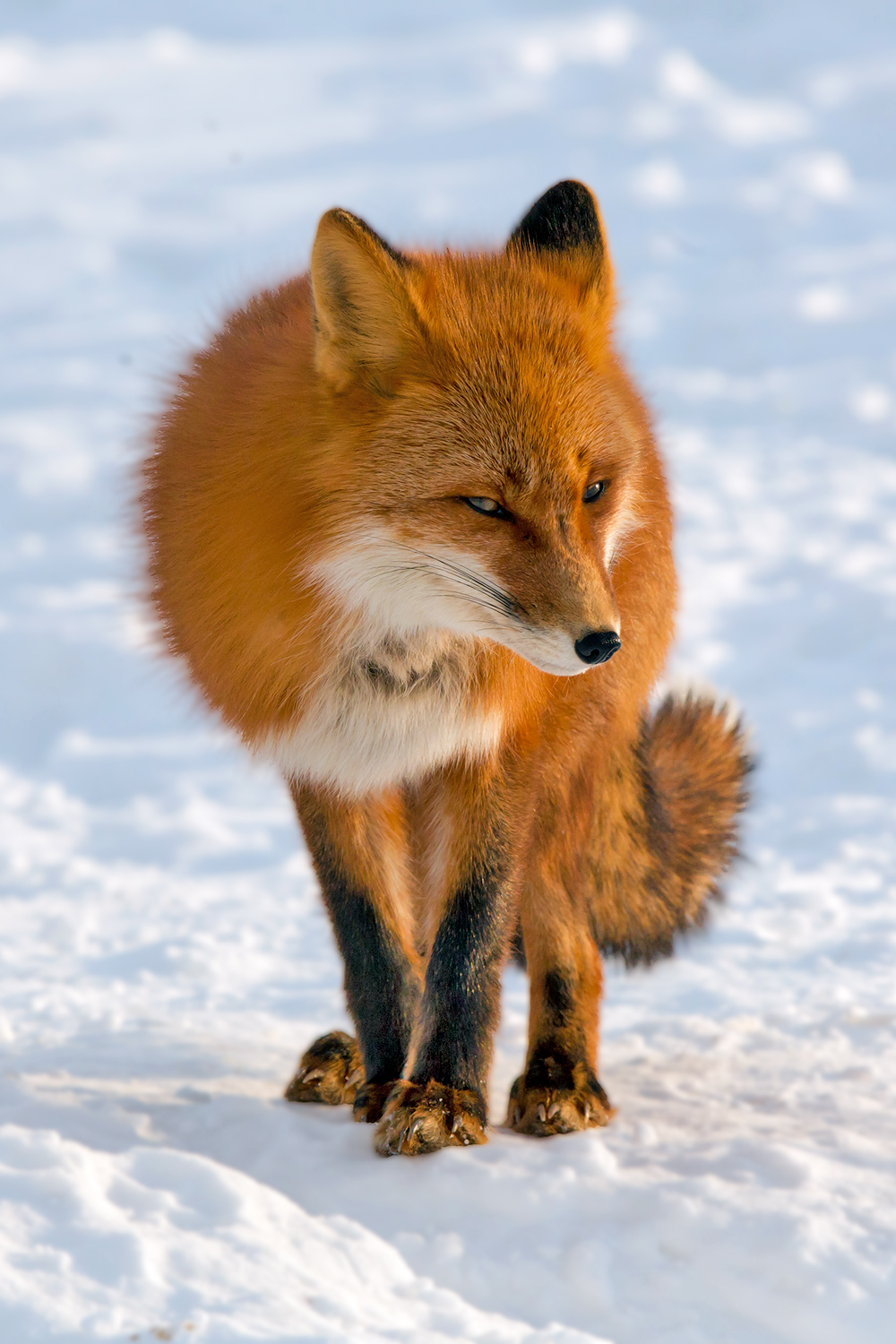 На фотографии изображена рыжая лисица, стоящая на фоне белого снега. Её густой мех контрастирует с холодной обстановкой, а хвост расслабленно лежит на земле. Снимок сделан фотографом Денисом Будьковым во время экспедиции на Камчатку.