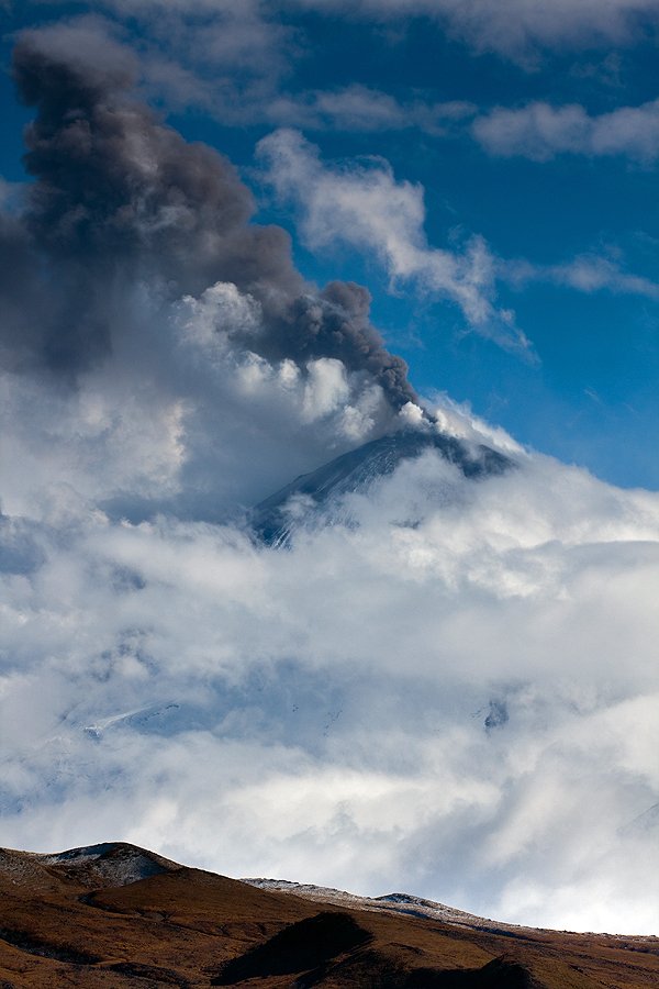 Укутанный облаками вулкан Ключевская сопка выбрасывает столб пепла на высоту до 8 км.