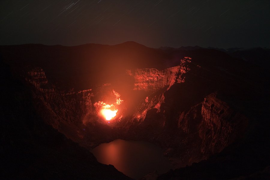 Ночь. Кратер вулкан Горелый с кислотным озером и Боккой в его стенке от куда вырывается раскаленный газ.