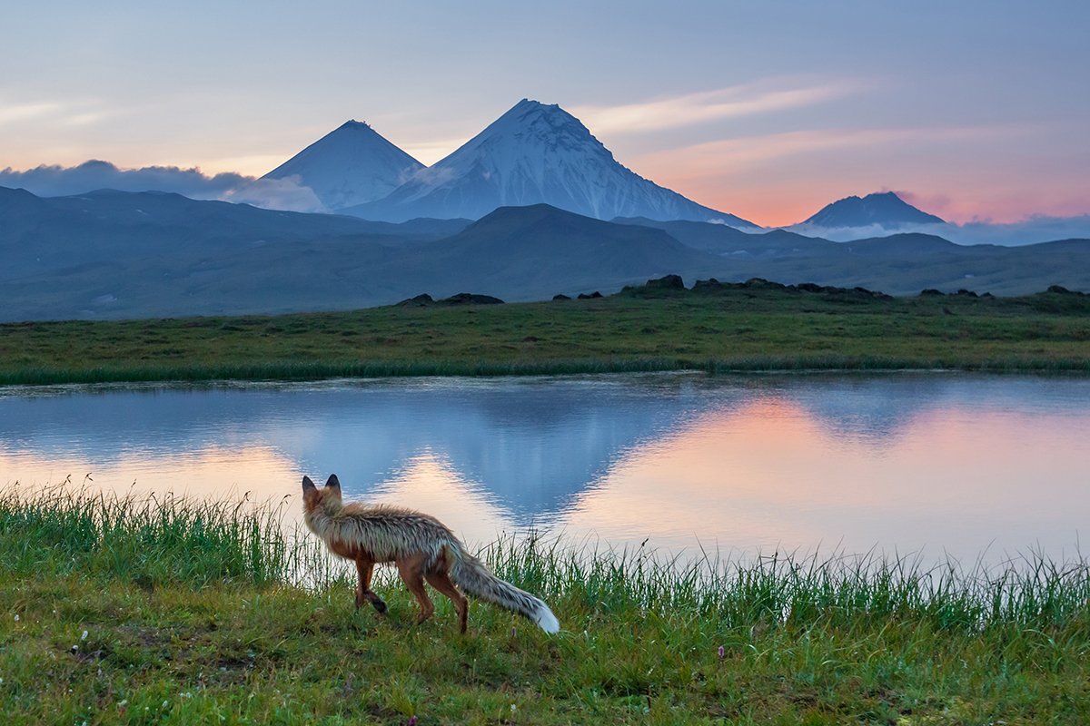 камчатка, лиса, природа, рассвет, путешествие, фототур, озеро, отражение, животные, Денис Будьков