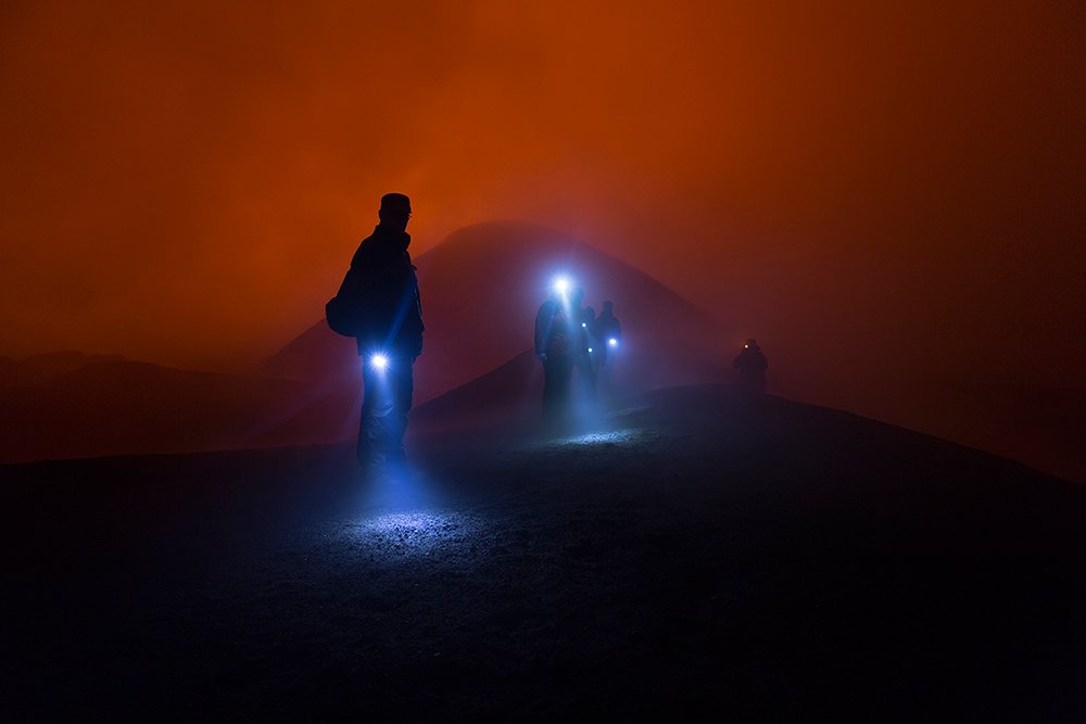Туристы возвращаются с действующего кратера вулкана Толбачик. Низкая облачность (высота 1500 м.) и свет раскаленной лавы бурлящей в кратере вулкан создают невероятные пейзажи.