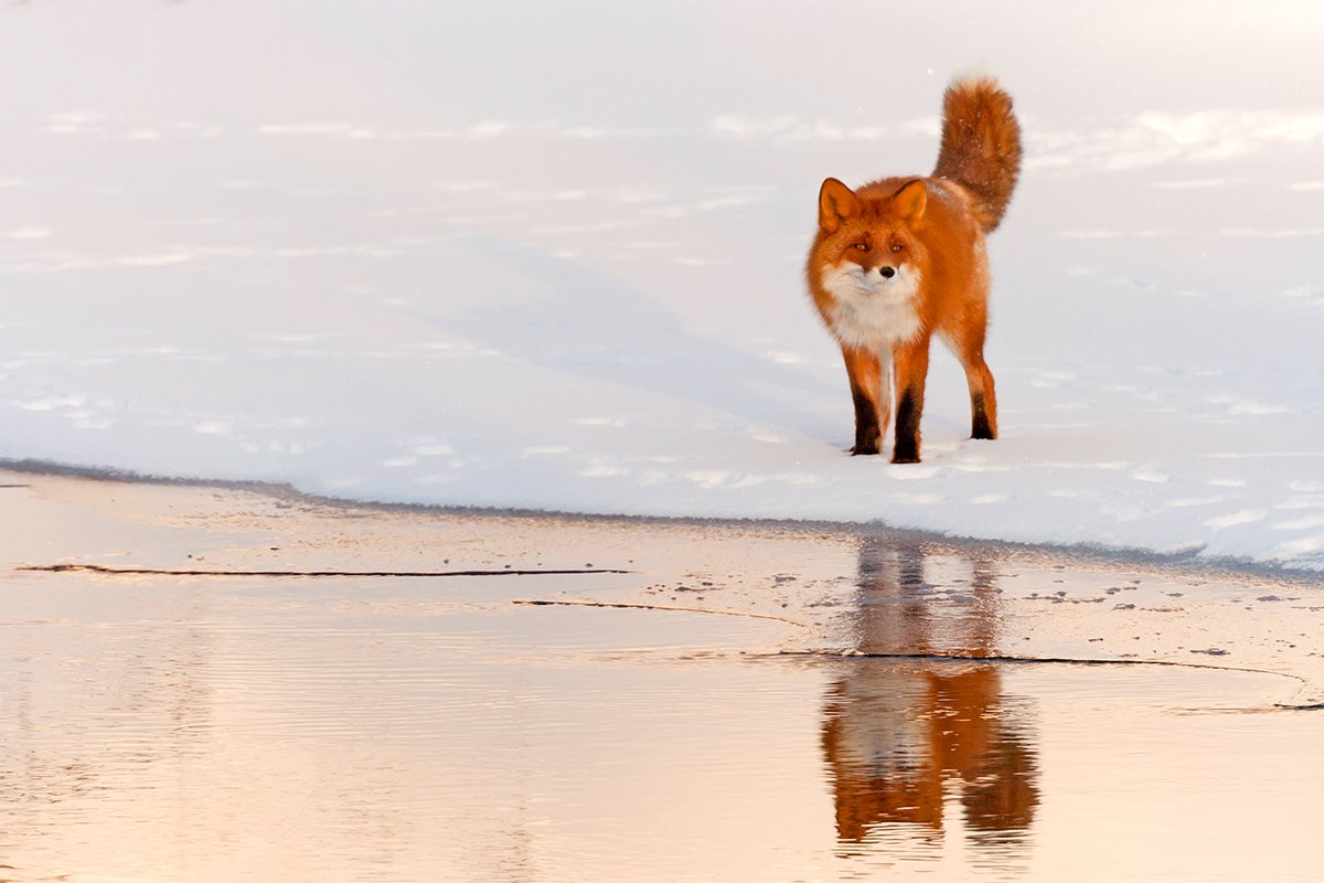 Лис обходит реку в поисках съедобного. Прогуливается он здесь не случайно именно в этих местах зимой обитают Лебеди-Кликуны. И тот факт что весной я обнаружил останки лебедя около его норы говорит о том что порой ему везет)