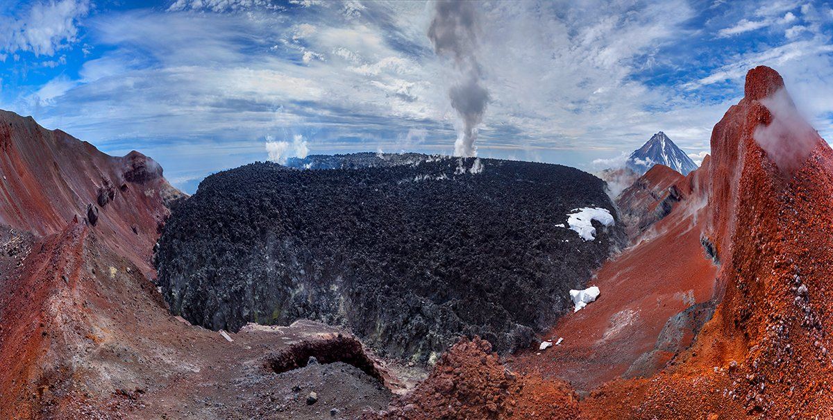 Панорама кратера вулкана Авачинский(2741 м.) заполненного лавовой пробкой в результате извержения 1991 года. На дальнем плане вулкан Корякский.