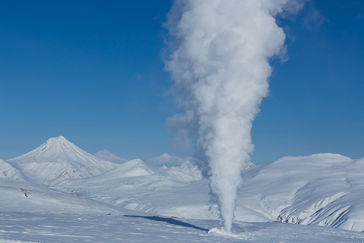На фото одна из старых скважин на склоне вулкана Мутновский. В нижнем левом углу видна работающая Мутновская Геотермальная станция, а также вулканы Вилючинский, Корякский и Авачинский.