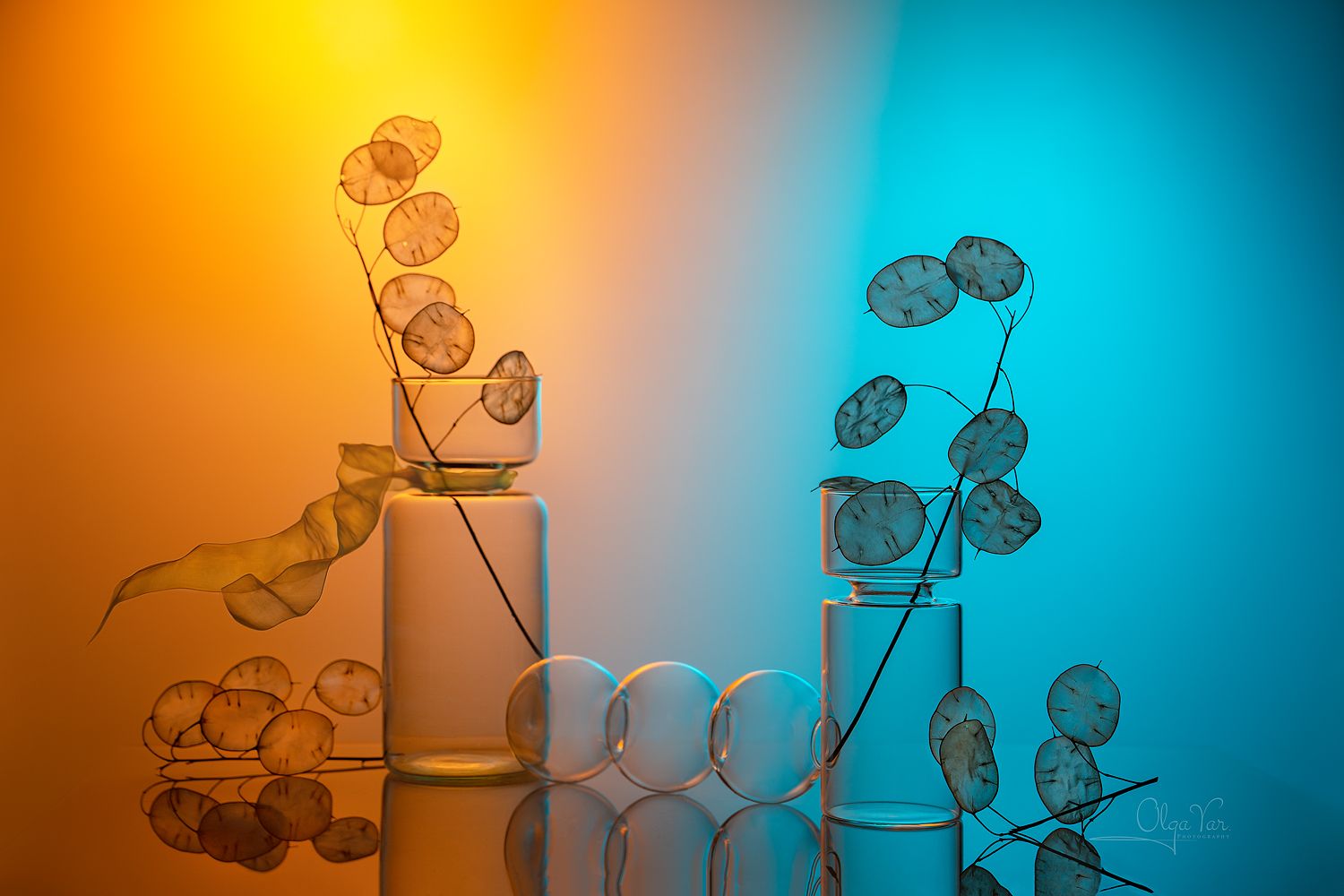 Композиция из стеклянных ваз с сушеными лунариями, освещённых контрастными оранжевым и синим светом, создаёт атмосферу спокойной эстетики. Глянцевая поверхность усиливает отражения, придавая снимку глубину и симметрию. Фотография демонстрирует гармонию природы и геометрии, где каждая деталь — часть целостного визуального решения. Работа Ольги Яр.