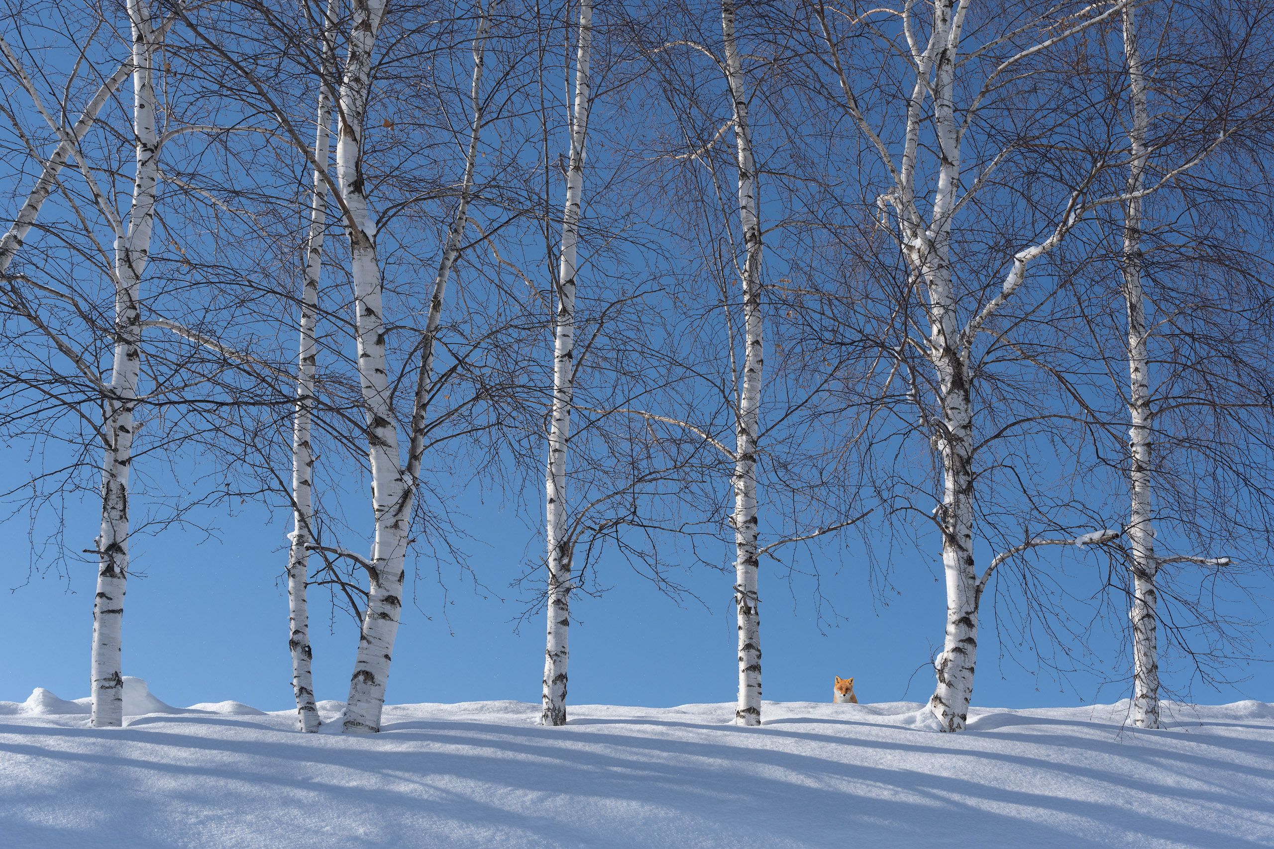 I was shooting beautiful birch trees on top of the snow hill with my wide-angle lens when this sunny fella came for a few seconds to check on me. Just enough time to frame. Fortunately, I didn't have my telephoto with me so instead of one more fox portrait I got a different frame, and I liked it for some reason.
