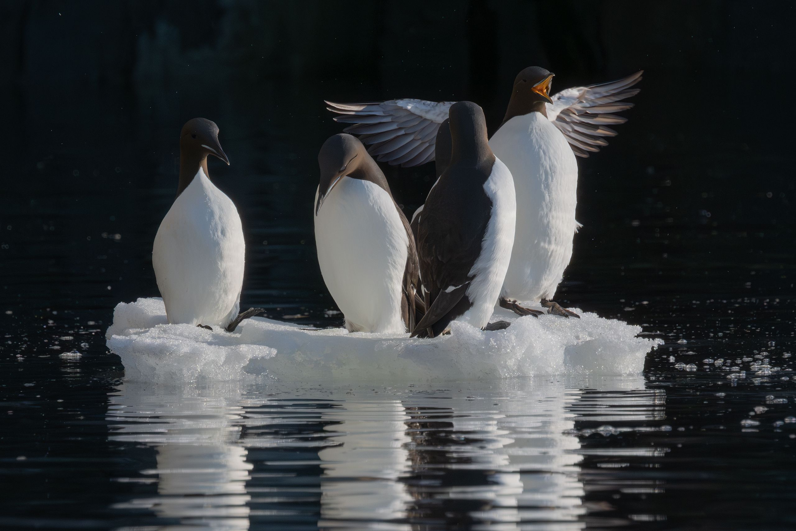 Brünnich\'s Guillemots, often mistaken for their southern relatives, on a drifting ice floe in Hinlopen Strait beneath the towering Alkefjellet Bird Cliffs. With their tuxedo-like plumage and upright stance, they certainly give off a penguin-like vibe—but these agile seabirds are built for the Arctic, thriving in the icy waters of Svalbard.
