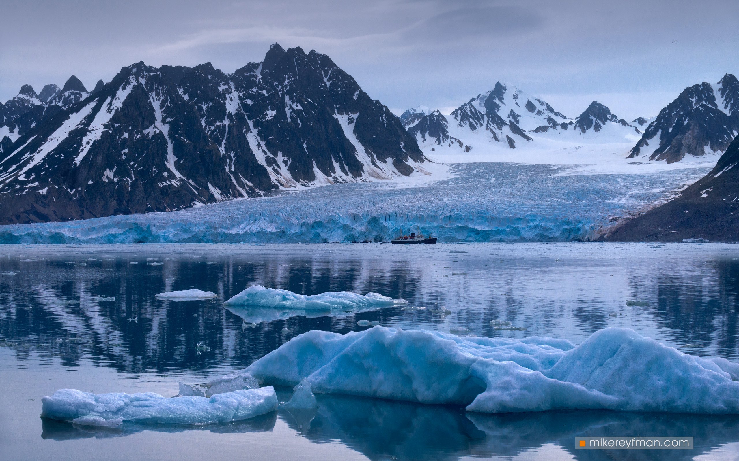 Expedition boat in-front of Monaco Glacier. Liefdefjorden (Love-fjord), Svalbard (Spitsbergen) Archipelago, Norway.