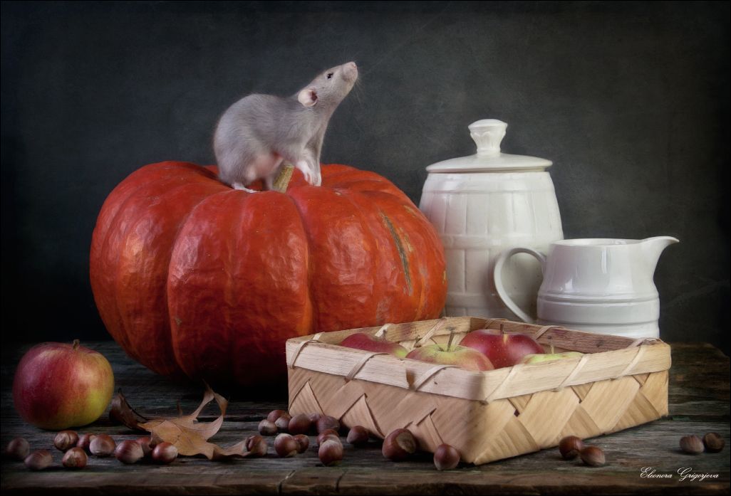 Мы не ищем лёгких путей)). Поэтому мне показалось мало Феликса, который хоть и похож на настоящего, но всё же игрушечный. И вот теперь у меня живёт Фредди. Это крыска дамбо очень красивого платинового окраса. Наблюдать за ним очень интересно, а снимать его ещё интереснее. Конечно, я пока не рискую снимать его вместе с кошками одним кадром, ведь дворянки мои - охотницы. Поэтому второй кадр, с Тиной, сделан в два кадра и слит в фотошопе.