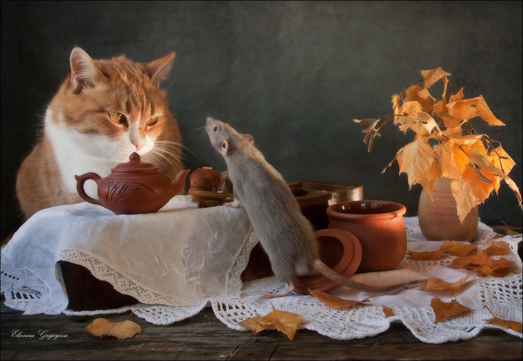 Крыс растёт и продолжает сниматься в разных сюжетах. Напоминаю, что с кошками я снимаю всех отдельно и потом сливаю два кадра в ФШ)). Опасности для жизни Фредди нет))