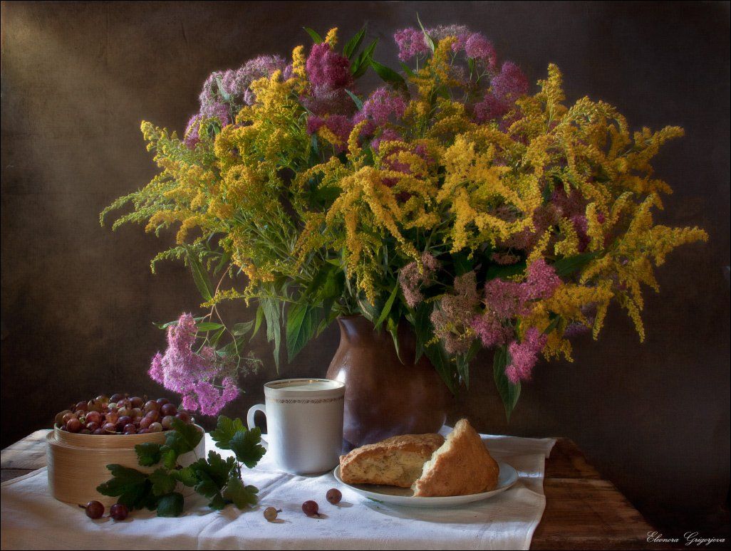 Крыжовник, Молоко, Натюрморт, Хлеб, Цветы, Eleonora Grigorjeva