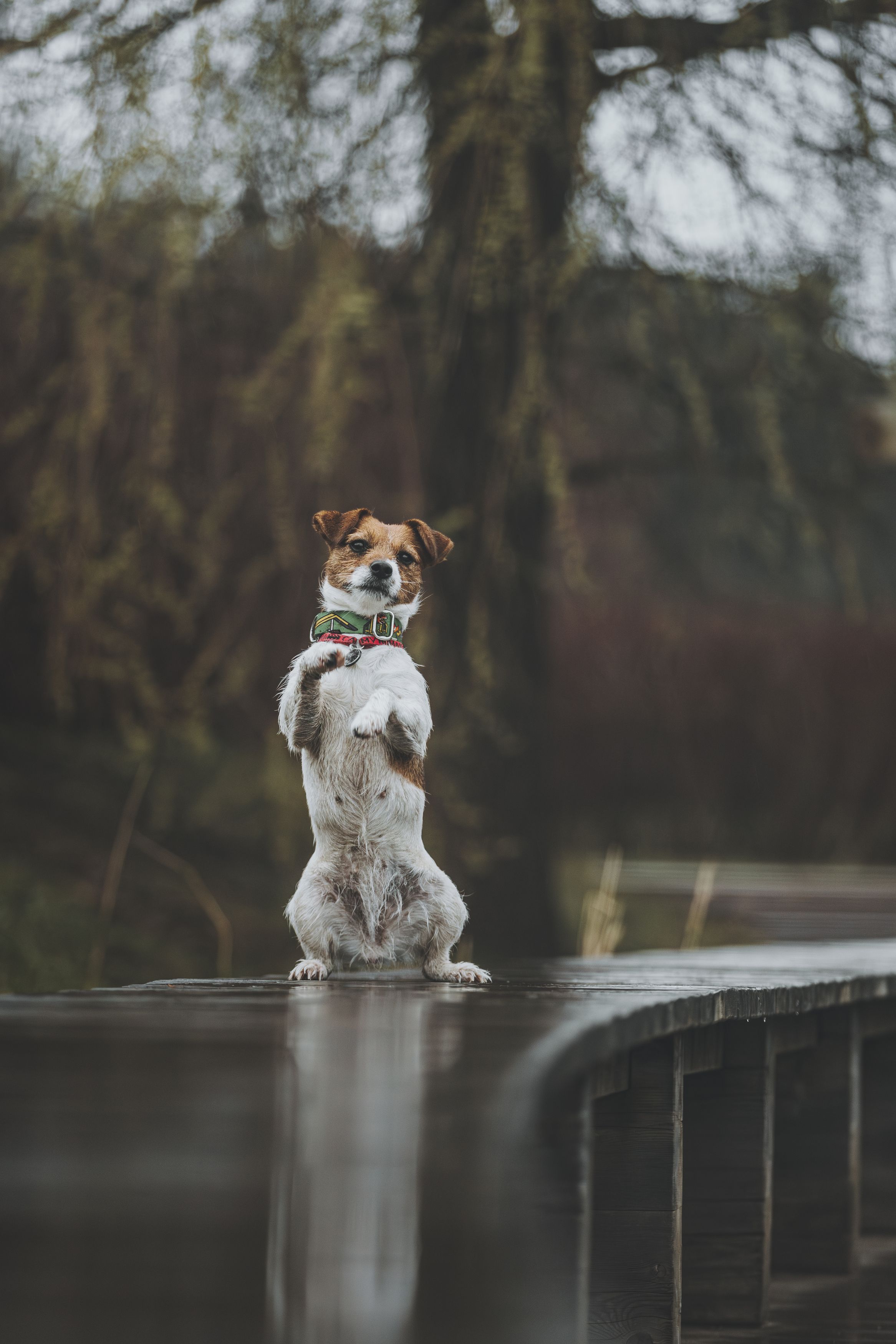 Полина, собака смотрит прямо в кадр — отлично. Фон размыт, но не слишком мягко: можно чуть глубже резкость на заднем плане для объёма. Динамика есть, настроение передано. Хорошая работа. 🐾🌧️
