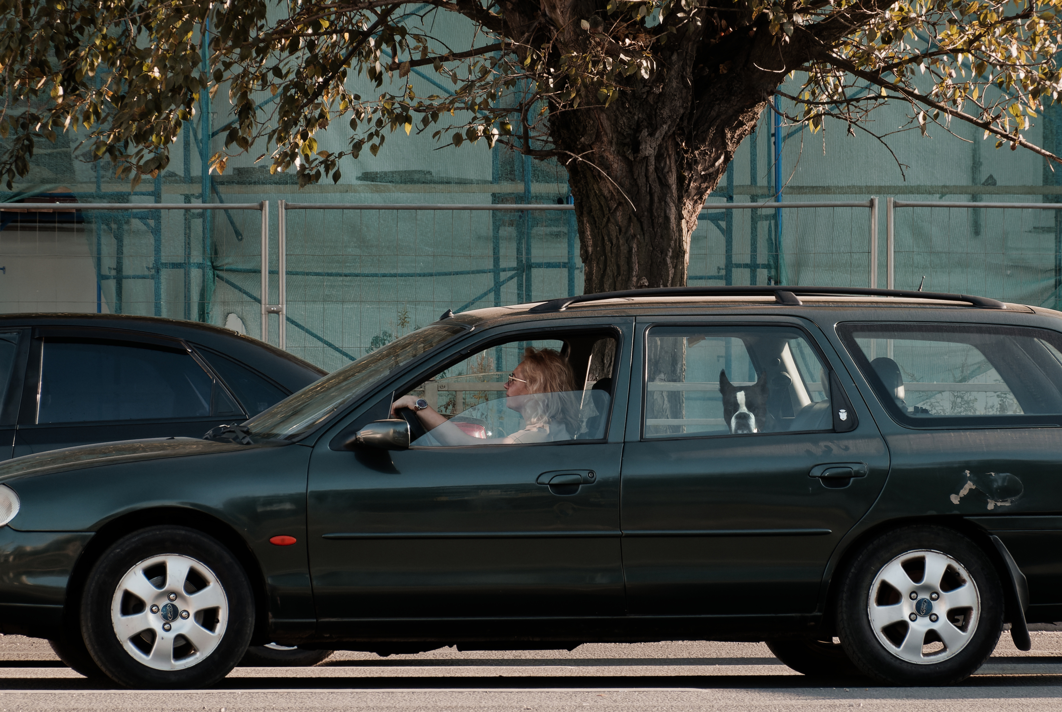 Роман, снимок — как кадр из повседневной истории: женщина за рулём, собака на заднем сиденье, дерево с листвой на фоне забора. Свет здесь — мягкий, почти вечерний, и он хорошо ложится на кузов машины, подчёркивая форму. Увидел в этом кадре ту же тонкую наблюдательность, что и в прошлых работах — будто ты просто прошёл мимо и зафиксировал момент, когда всё в порядке, но в нём что-то есть.