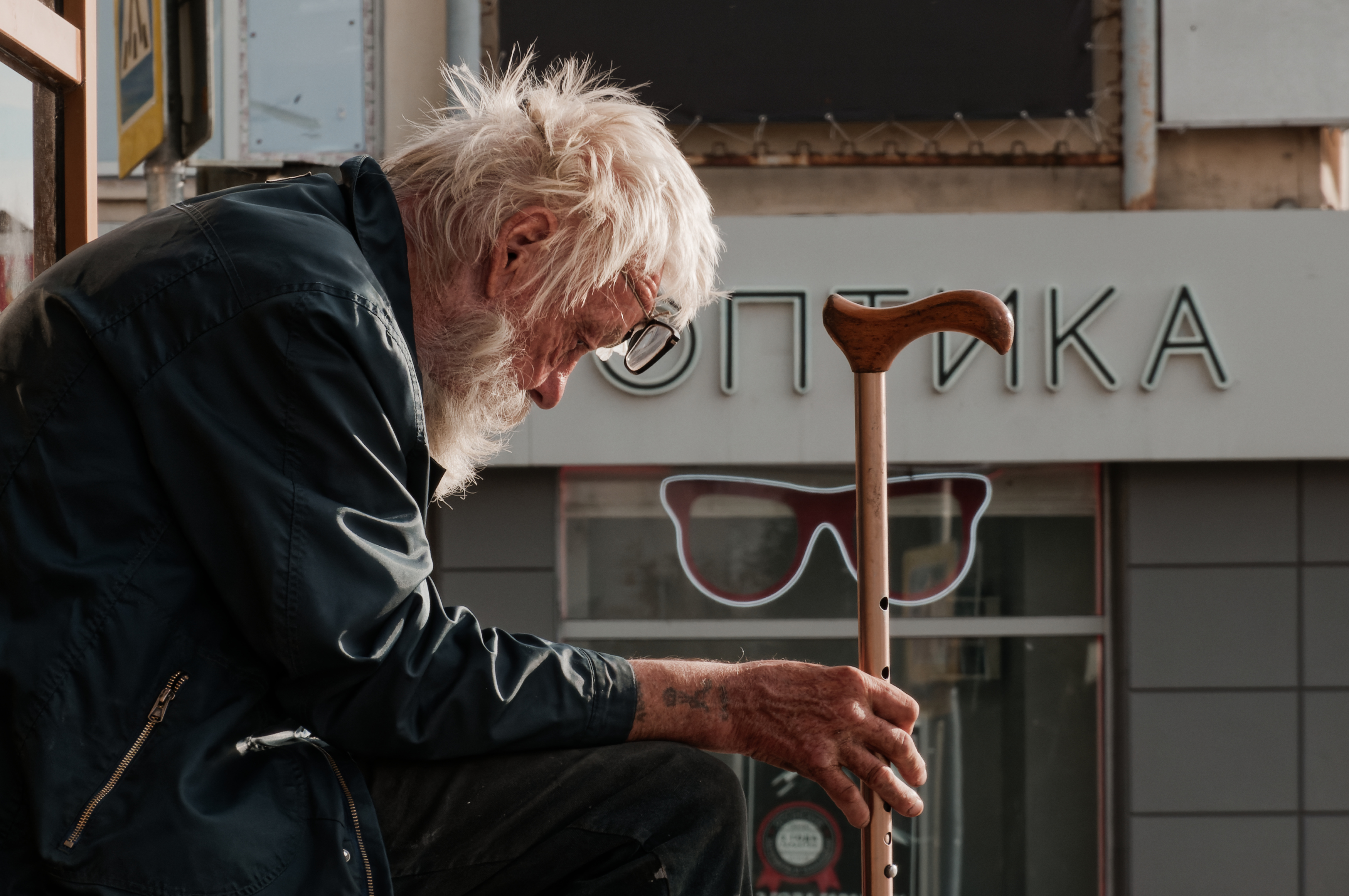 Роман, вы снова захватили момент, где свет и тень вступают в диалог — как в прошлых кадрах, но здесь он тяжелее, глубже. Старик с тростью, наклонившись, словно в разговоре с самим собой, — это не просто портрет, а кадр из жизни, где время остановилось на мгновение. Оптика на фоне — почти символ: зрение, потеря, восприятие. Всё это — ваша привычка снимать не то, что видно, а то, что чувствуется. 📸