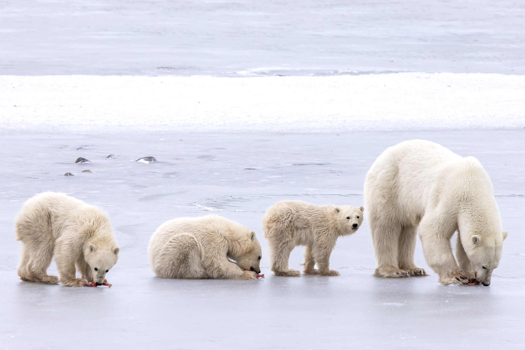 A devoted polar bear mother and her three cubs, a tableau of contrasts as the smallest one searches for sustenance in a world where ice's absence makes finding food a daunting challenge