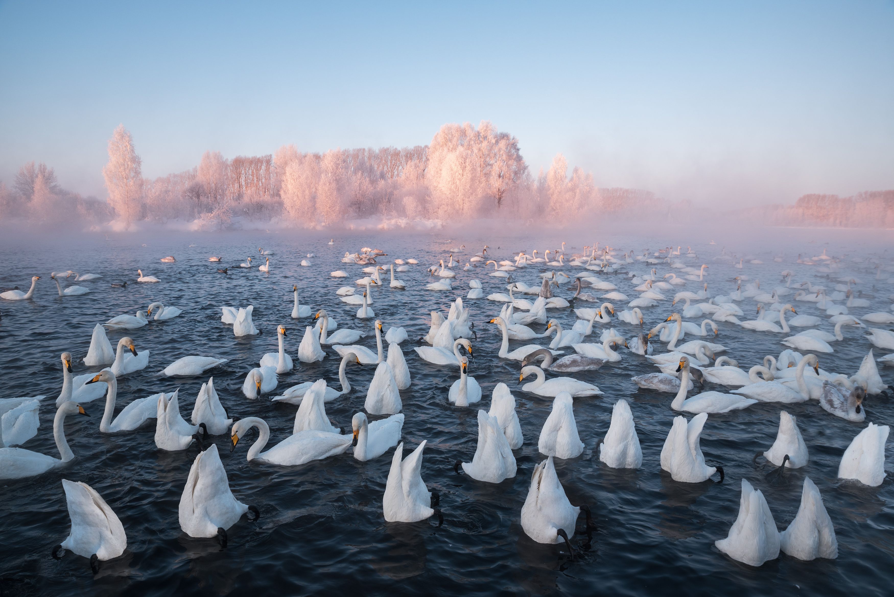 Озеро Светлое в Алтайском крае. Сюда на зимовку слетаются сотни диких лебедей-кликунов.