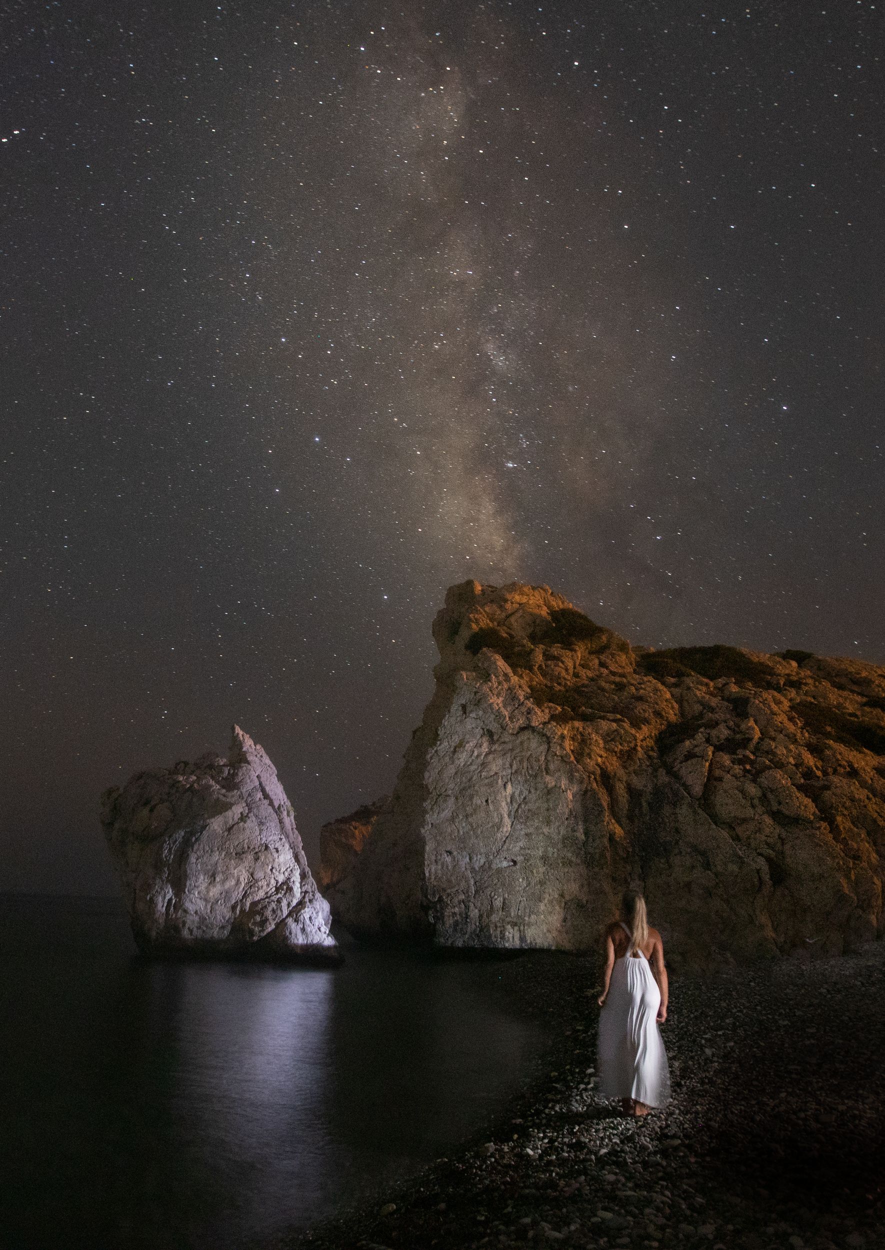 rock, milky way, stars, night, night photo, landscape, sea, Roman Bevzenko