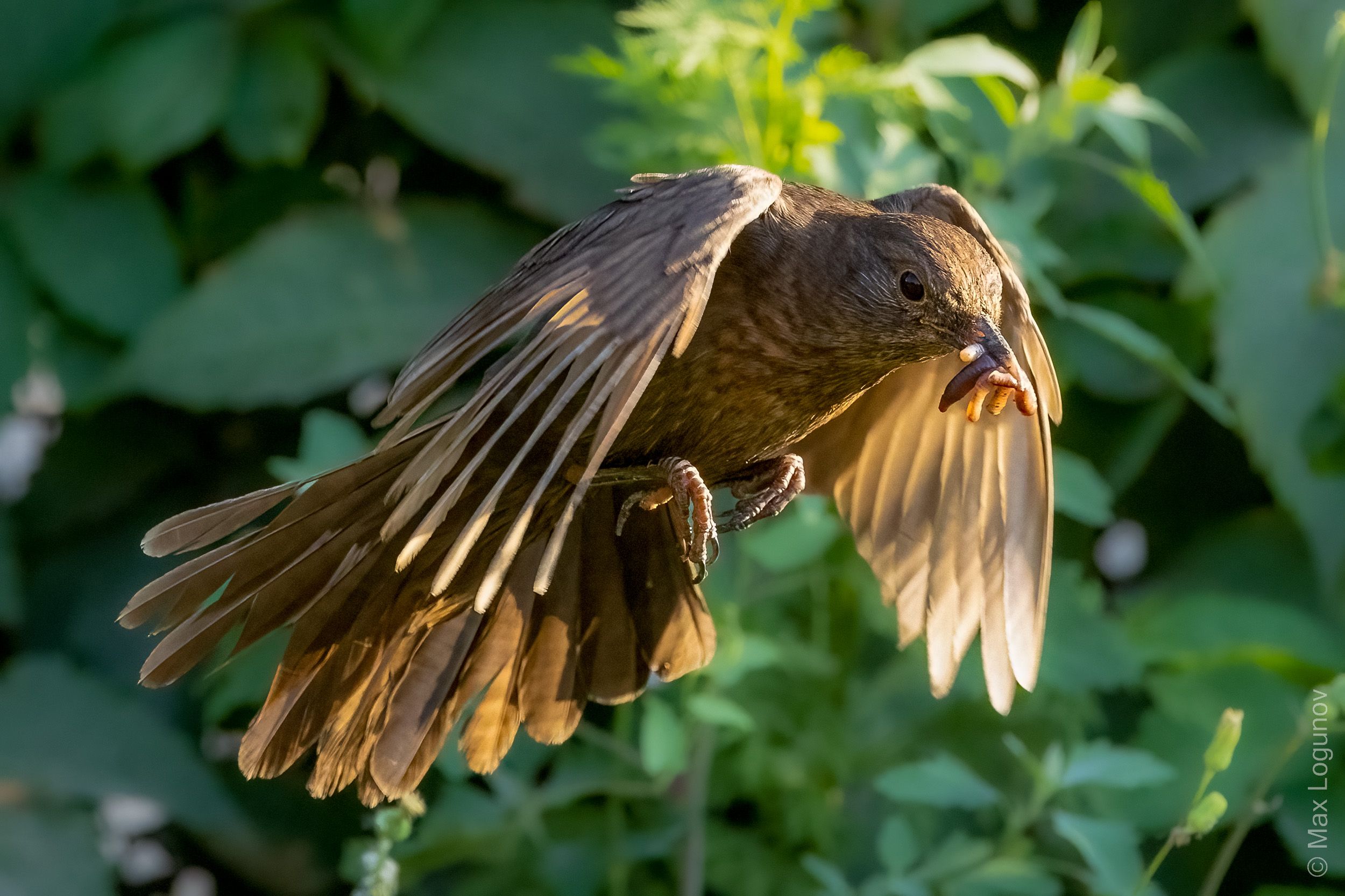 Самка чёрного дрозда (Turdus merula) с полным клювом провизии для птенцов