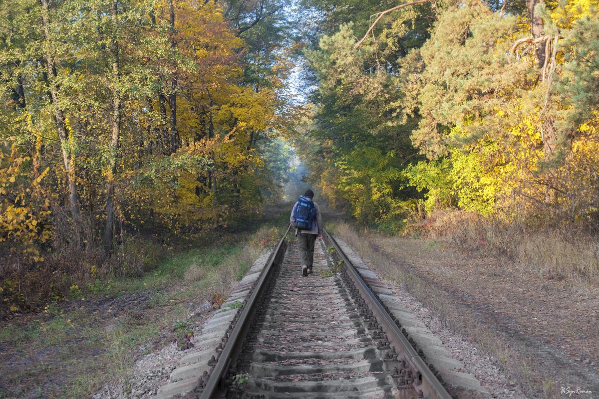 осень, утро, железная дорога, лес, человек, турист, Roma  Chitinskiy