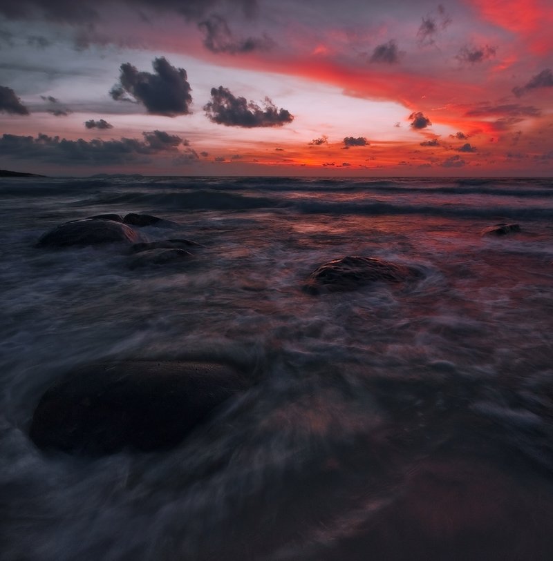 В тропиках сильная влажность приводит к ярким алым закатам. Атмосфера быстро набирает цвет и медленно темнеет...глаза быстро меняют экспозицию и в каждое мгновение мы видим новые градации цвета, просторанство сужается, пока источник совсем не прекратит свое свечение.