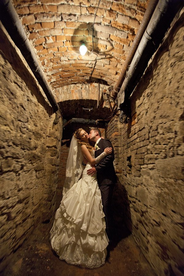 мда...контраст, шикарные невеста и жених...и старый подвал)