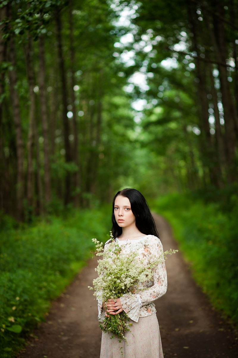 девушка, цветы, лес, волосы, букет, дорога, Ровдо Яна