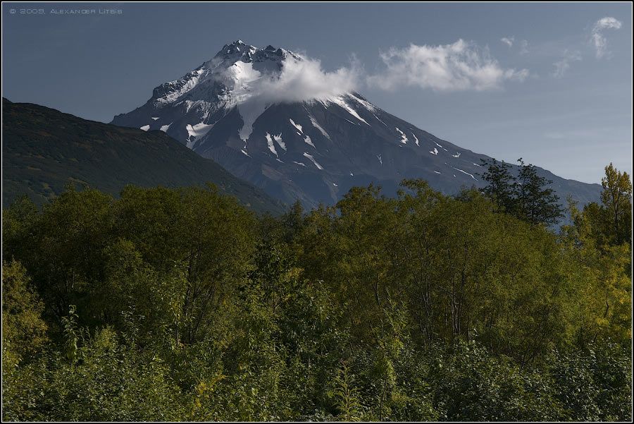 Вилючинский вулкан. Там на вершине в снежниках, теплые восходящие потоки конденсируются и рождаются облака, отрываются от вершины и начинают свой путь над долиной.