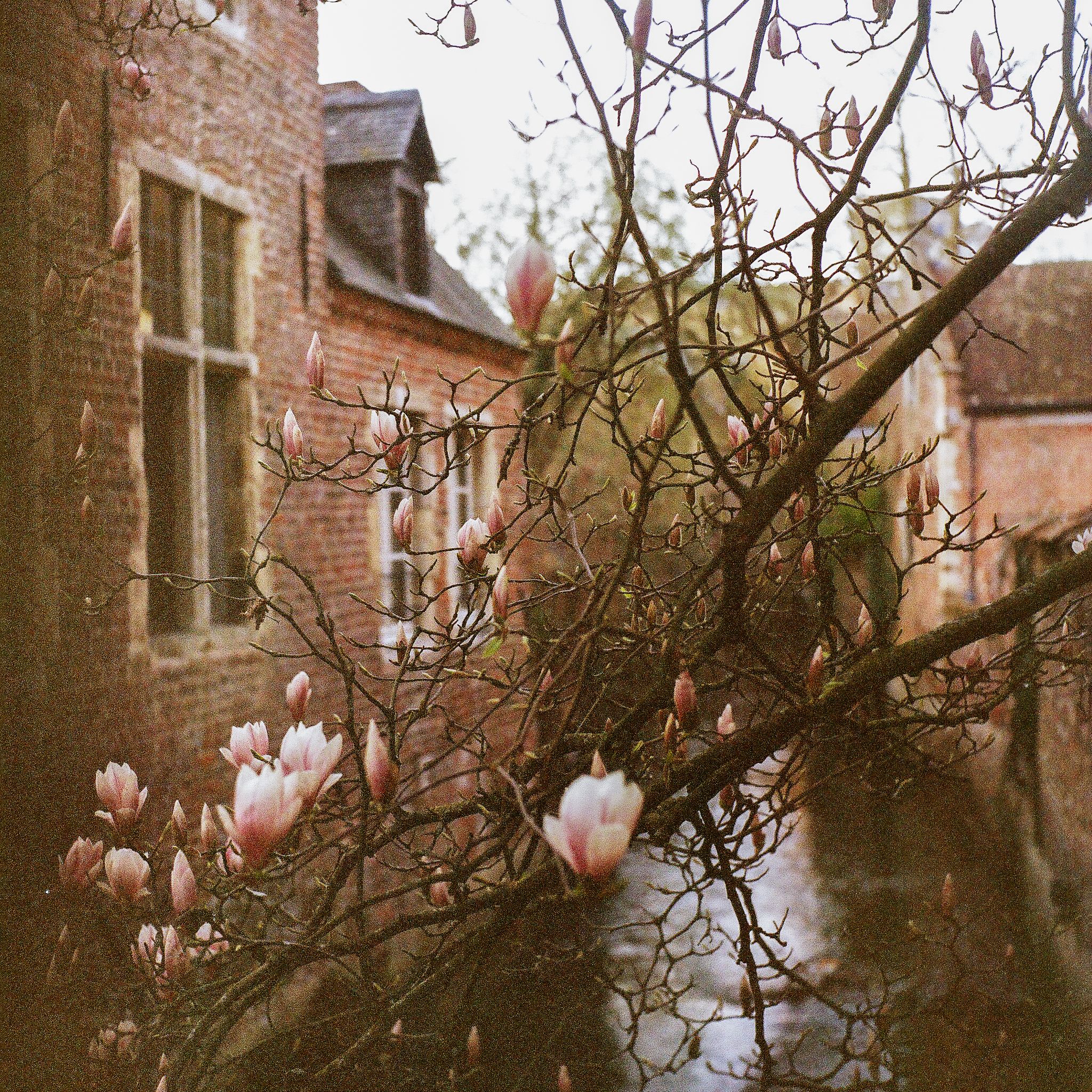 Spring awakening captured on film. Delicate magnolia blossoms create a soft contrast against weathered brick and vintage architecture. Shot with a Yashica MAT124g on Lomography color film, embracing the dreamy, nostalgic quality that only analog photography can deliver.