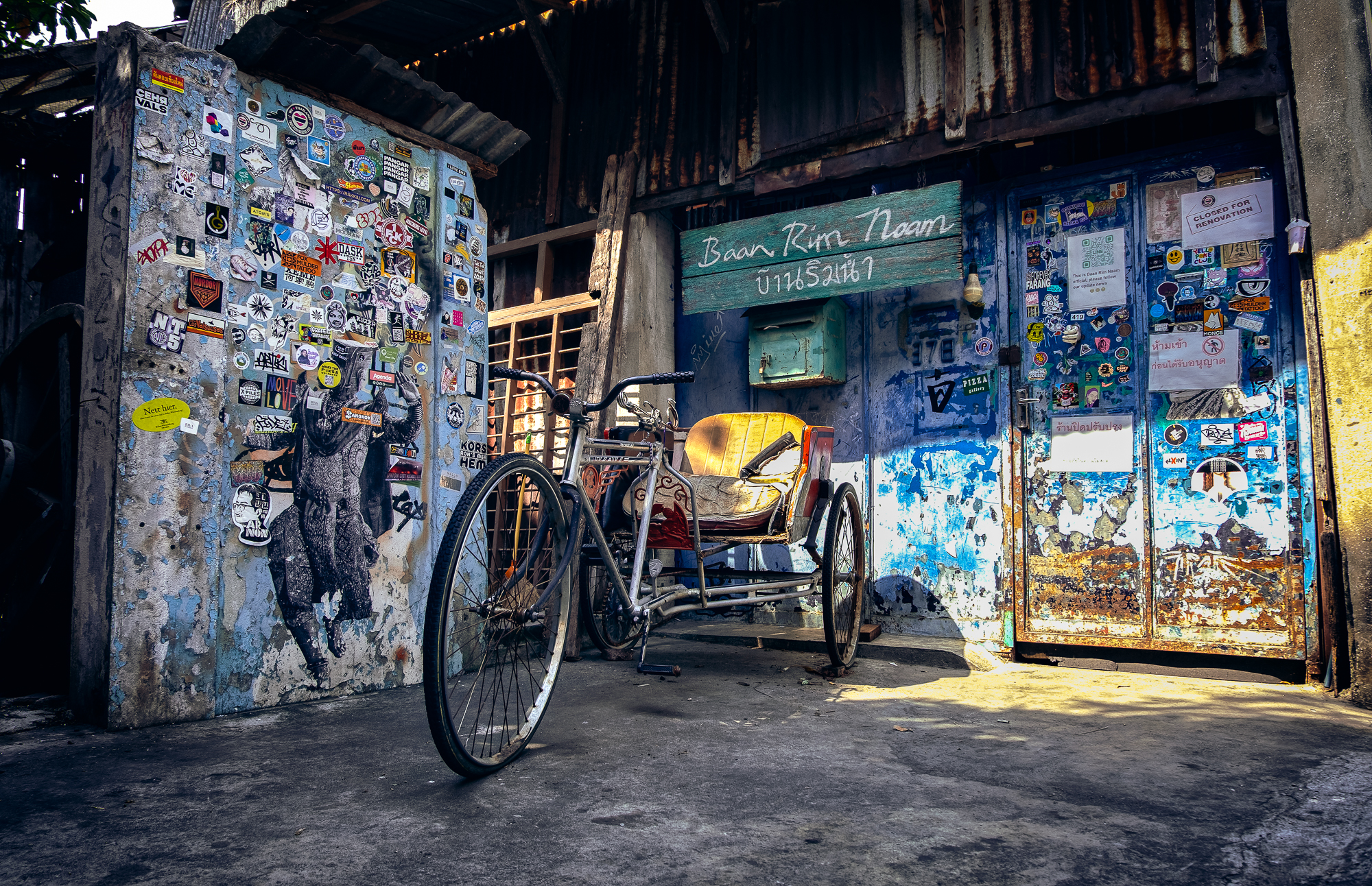 Baan Rim Naam reads the weathered sign above walls that have collected decades of stories—stickers from every corner of the world adhering to paint that remembers other eras. Light pours through gaps in corrugated metal, illuminating a rickshaw that\'s both transportation and time machine.