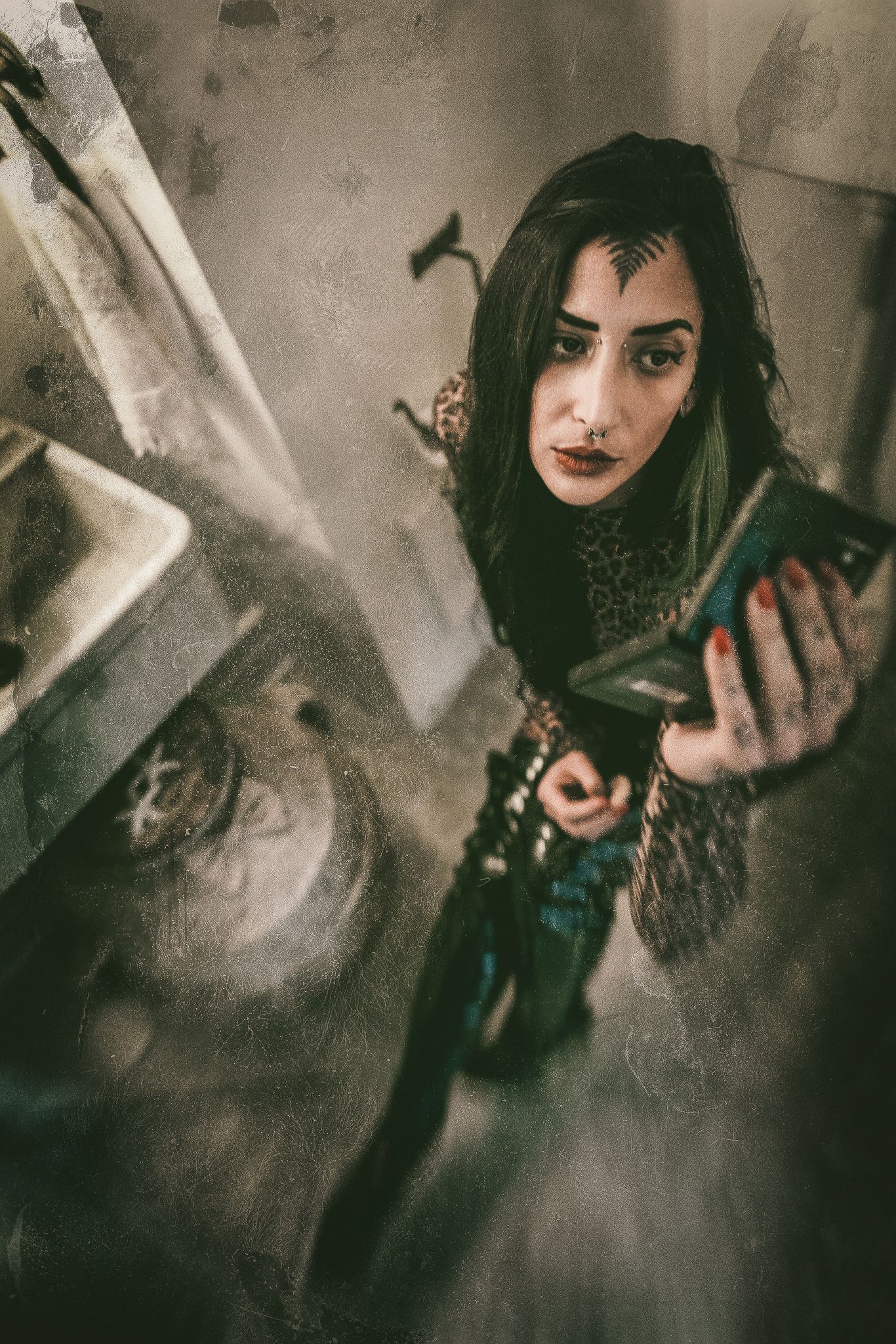 portrait, woman, gothic, dark, alternative, mirror, abandoned, decay, grunge, moody, atmospheric, tattoo, piercing, brunette, pale, Rozman Erik