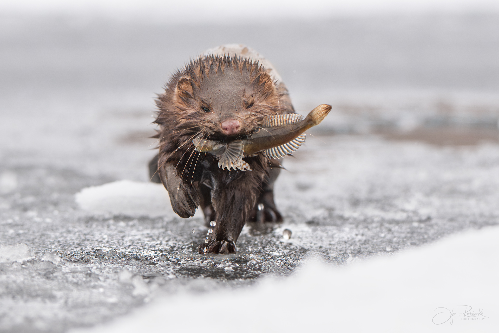 Ольга, как же красиво получилось — норка с рыбой, будто только что выскочила из воды, и всё это на льду, с брызгами и морозом в глазах. Кадр — живой, как будто можно услышать хлюп зверя по льду.