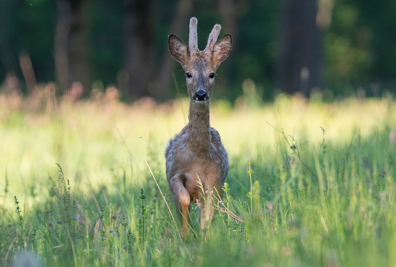 Неожиданная встреча с молодым самцом европейской косули. Рассвет, май, опушка леса в Тульской области.