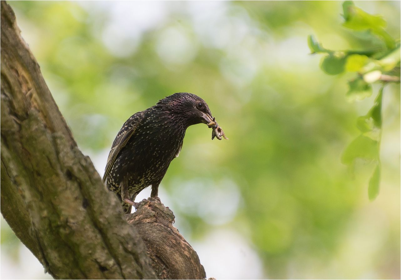 Скворцы в мае, в период выкармливания птенцов.