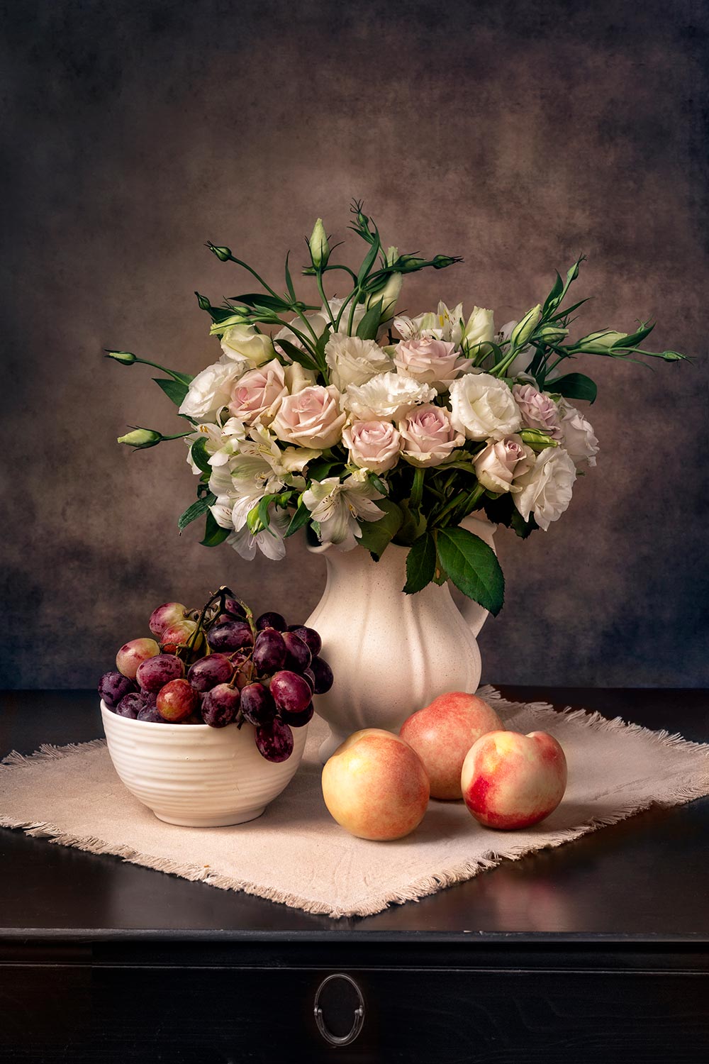 нектарины, виноград, цветы, ваза, стол, салфетка., Рут