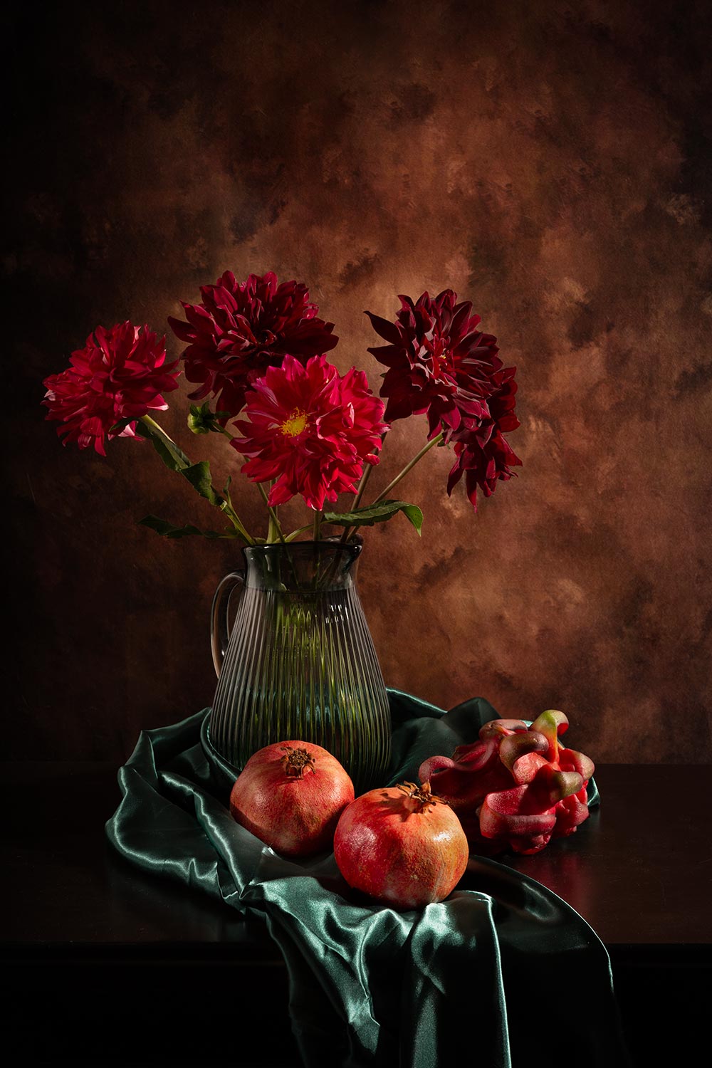 цветы, ваза, гранат, петайя, стол, драпировка..., Рут