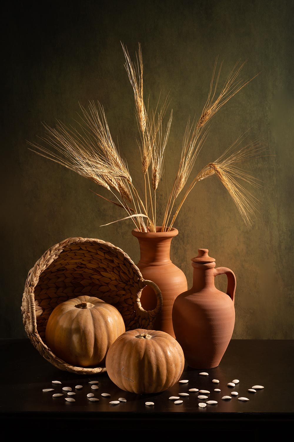 Тыквы, корзинка, кувшины, колосья пшеницы, тыквенные семечки., Рут