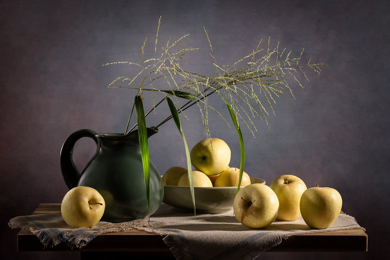 стол, салфетки, яблоки, кувшин, стебли травы., Рут