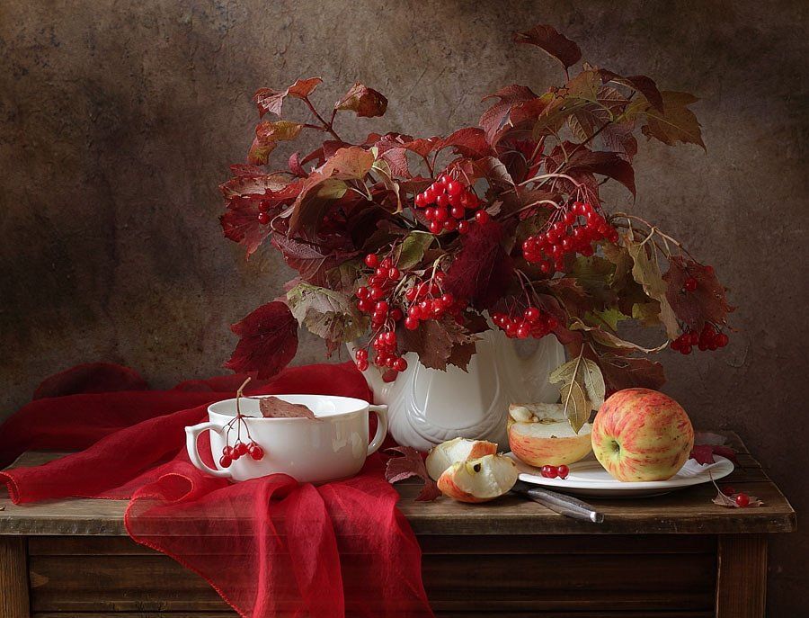калина, яблоко, ветка, осень, натюрморт, Галина Рябикова-Багузова
