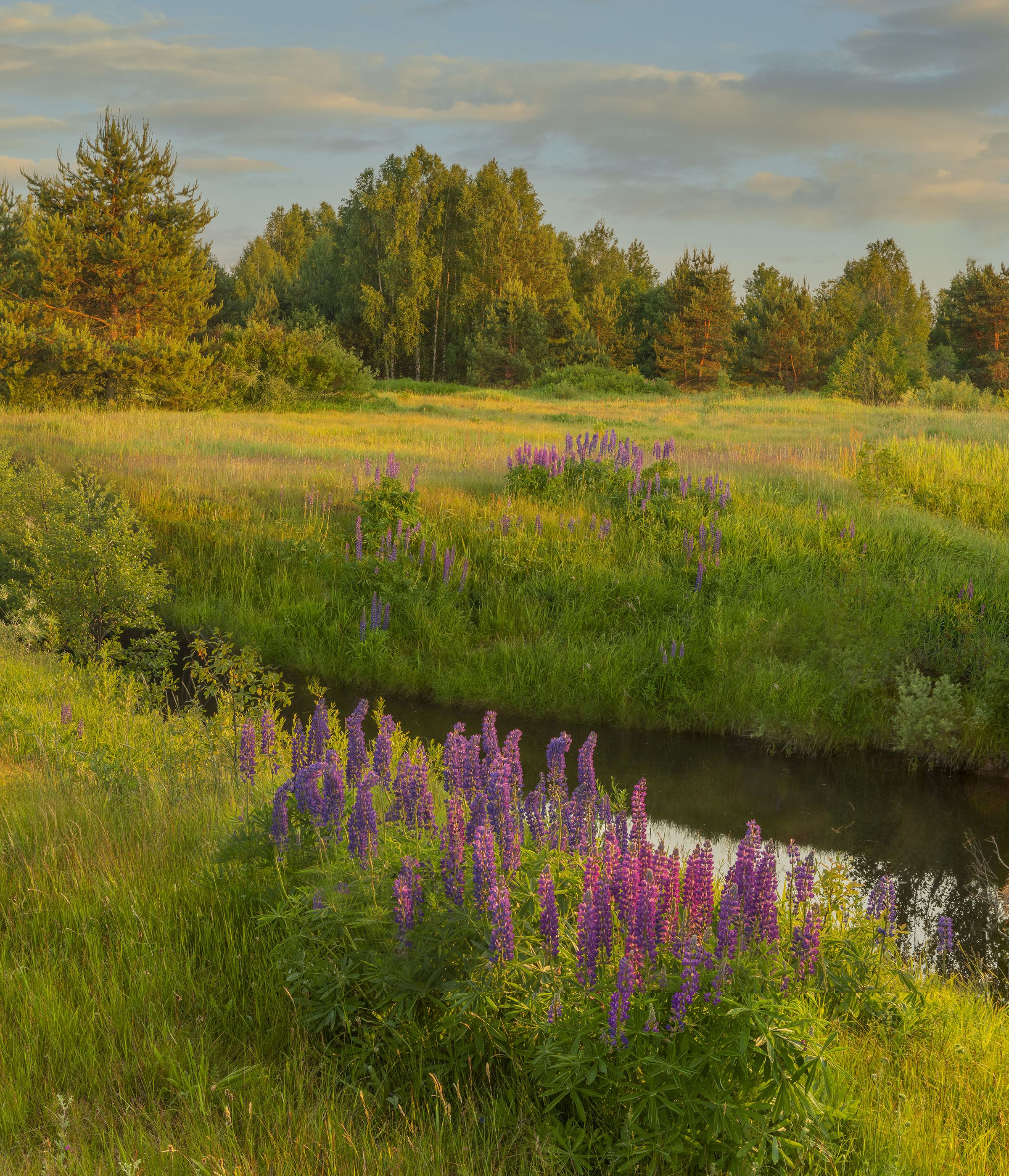 Я живу в Москве с двадцати лет. И езжу в свою деревню в Нижегородскую область все эти годы. И там фотографирую. Но мне пришлось очень много фотографировать на Северо-Востоке России, много лет – Колыма, Якутия, Чукотка, Корякия. Больше всего на Колыме, то есть в Магаданской области. Потом присоединились – русский север – это много Кольский полуостров и много Карелия, также Кавказ, Крым, Урал, Кузнецкий Алатау, много Алтай, Подмосковье, владимирская область, очень много тверская, костромская. Так вот про деревню. Фотографировал всегда, как всегда. Когда началась пандемия, уехал в деревню на восемьдесят дней. И вот там то и поменялись мои вкусы. У меня было время, и я стал находить не тронутые человеком места, на самом деле не тронутые в последние годы. А во время колхозов не тронутых мест не было. Земле доставалось по полной. Как она выжила только. И для меня люпины, смолка, колокольчики стали основными цветами в июне, которые я стал включать в снимок в качестве переднего плана. Добавлю, что и передний план у меня поменялся по крупности. Он стал более крупным. Возможно, надо делать еще более крупным, то есть сверхкрупным. А вообще зеленый цвет, особенно дневной, цвет угнетающий. У меня своя теория, почему основной цвет, на котором идет максимум энергии от солнца ( именно поэтому наш мир – зеленый, потому на нем идет максимум энергии ), зеленый цвет является угнетающим, а розовый самый лучший цвет для живого, но это могу объяснить в следующий раз. Так вот цветы, ну например, люпины – контрастны к зеленому по цвету и очень гармоничны с ним в пейзажах. Контрастны – это следующее – зеленый плюс пурпурный – получится серый. Эти два цвета контрастны. Также голубой – красный, желтый – синий. Цвет люпинов для меня самый любимый. Основной тон у него – пурпур, хотя он может принимать множество оттенков и тонов, в зависимости и от освещения и от почвы. На этом снимке растут люпины с обеих берегов речки. Янтарный вечер. Я брожу вдоль речки и наслаждаюсь вечерним ярким светом, все кругом горит в теплых солнечных лучах. Похожу до того времени, как солнце перестанет освещать берега и поеду домой. До дороги, где стоит машина, с километр.