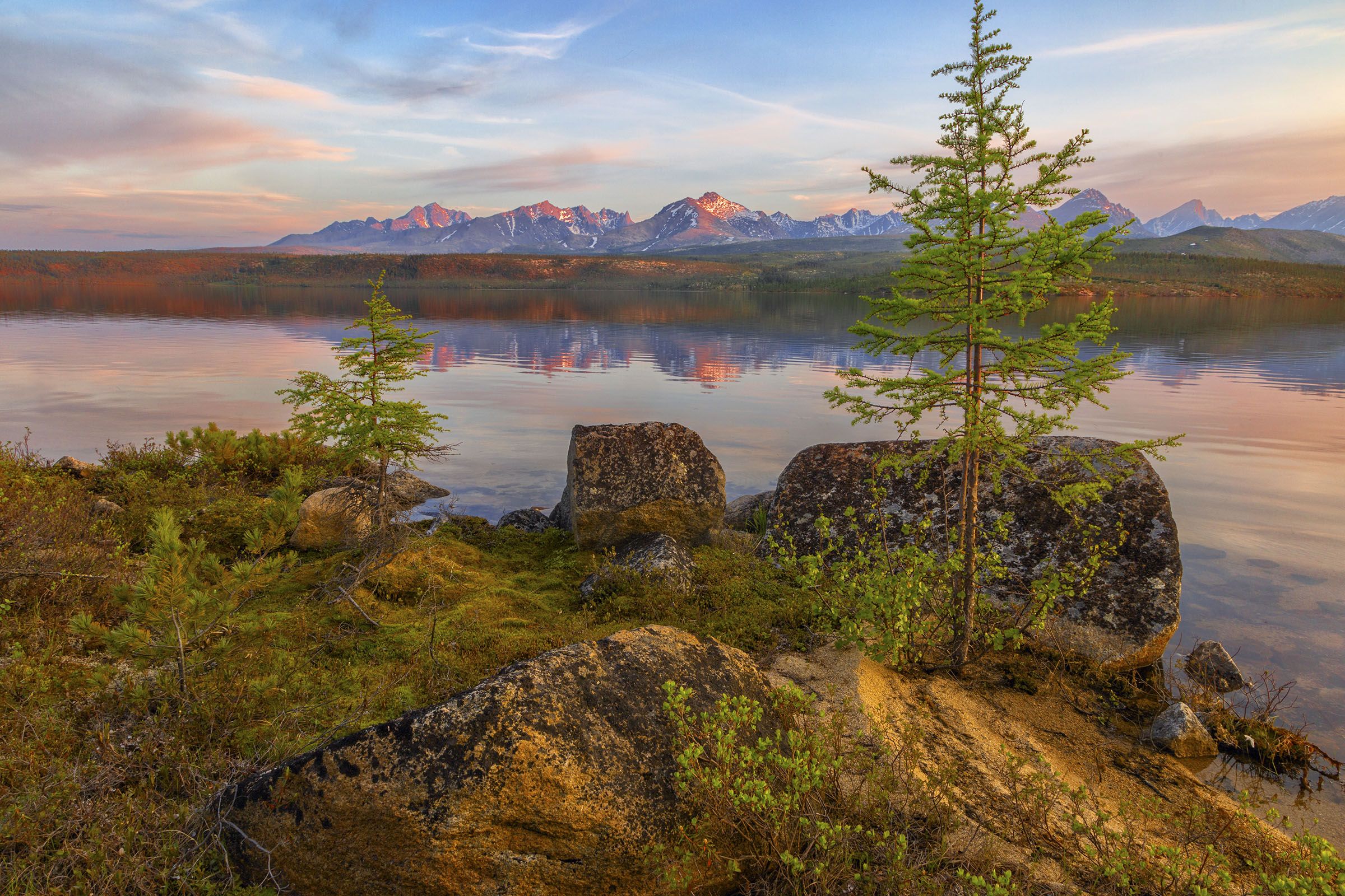 На снимке вид с Габудинской косы. Габудинская Коса небольшая, меньше ста метров. Она идет изгибом вдоль озера, которое здесь имеет сложный рельеф берега. Она ценна для фотографов тем, что отсюда смотрится панорама на хребет Большой Аннгачак, отличающаяся от вида с Косы Биологов. Отсюда лучше видна восточная часть этого хребта и, наконец, виден остроконечный пик Челленджер. Его остроносый пик действительно похож на космический корабль Челленджер, поэтому его и назвали так. Вечерние июньские лучи заходящего солнца превратили в тепло-холодную пастель горы остроконечного хребта. Неудержимо хочется попасть в бесконечные предгорья хребта Большой Аннгачак, покрытые огромными плантациями северных рододендронов, синхронно с ветром качающих своими солнечными головками. Озеро затихло перед наступлением июньской ночи, и горы рельефно и эффектно отражаются в нем. Иногда попискивают надоедливые комары, но в целом стоит райская тишина и нам не хочется уплывать отсюда даже после угасания последних красок и превращения хребта в темную громаду. И мы гребем в лодке уже почти в ночной тишине и видим, как гаснет небо, и чернеют горы. Сайт: https://www.russiantravel.pro/.
