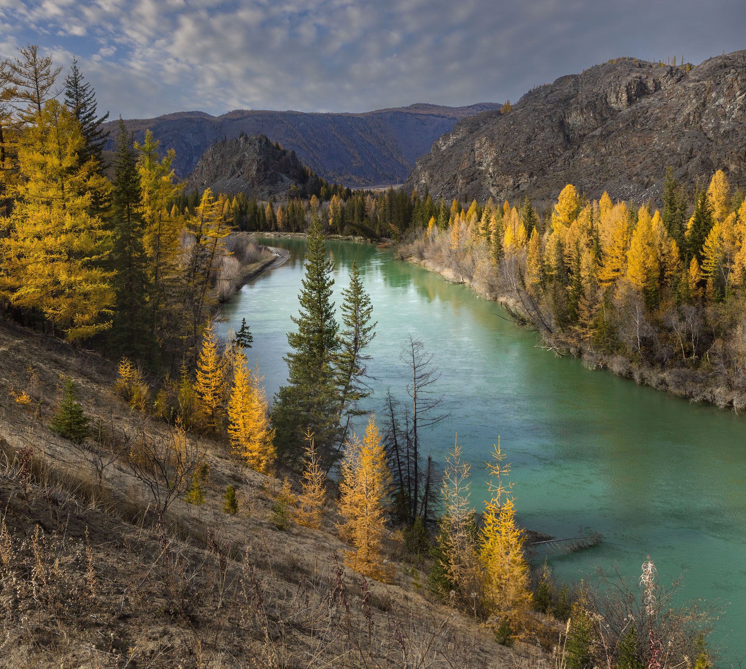 Река Чуя начинает просветляться от мути в конце сентября. Перед Кураем, большим поселком на Чуе, там, где курайские степи, Чуя изгибисто протекает по чуйской долине. Здесь можно выигрышно фотографировать и с дрона и без него. На снимке Чуя, протекающая совсем рядом с дорогой. Лиственничные деревья одели свой праздничный осенний наряд, который контрастирует с цветом реки. Тридцатое сентября. Я буду проводить фототур в колнце сентября на реке Чуя, в курайских степях, на озере Джасгынколь, в ущелье Актру, Кату-Ярык. Скоро дам объявление на сайте. Также буду проводить фототур на Алтай на цветение маральника. Подробности на сайте: https://www.russiantravel.pro/.