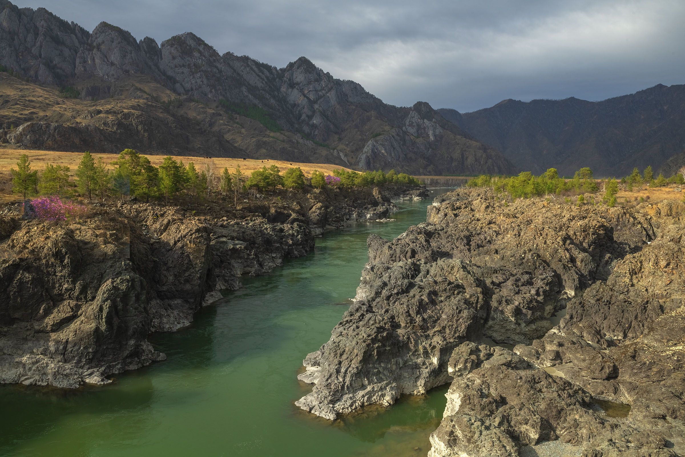 Катунь в начале мая еще неплохо зеленит, но с каждым днем мутнеет. И станет совсем мутной после пятнадцатого мая. Ездили вдоль Катуни из гостевого, когда фотографировали цветение розового маральника. В 2021 году он цвел местами очень густо, местами средне. Мы съездили на Чую и вернулись, там цветение еще не начиналось. А вдоль Катуни и на ее притоках было много, и нам удалось сделать хорошие фотосъемки. На снимке Катунь в узком месте. Здесь железный мост, по которому ходит много туристов. Снимок сделан с моста. Здесь достаточно красиво и много сон-травы.Я буду проводить фототур на цветение маральников на Алтае с 7 мая по 15 мая этого 2024 года.