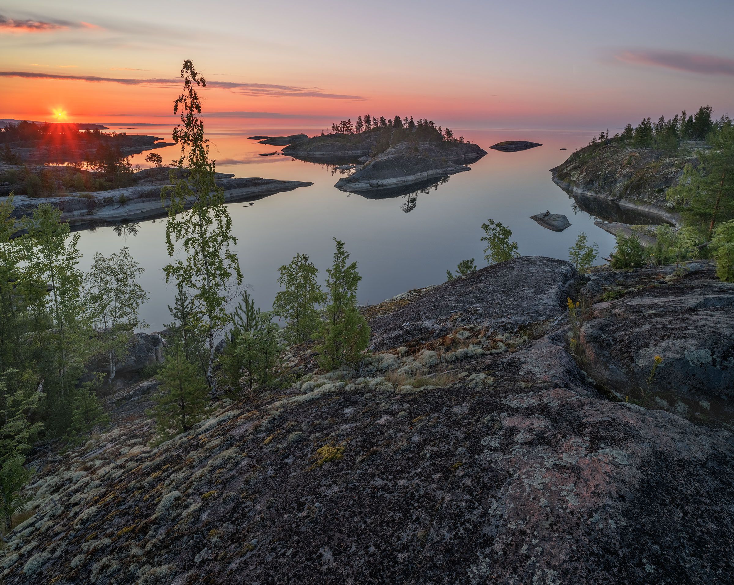 Мотор мерно работал, не напрягая сил, я сидел на руле и держал газ на среднем уровне, мы шли прямо на выступающий слева острый скальный мыс. Он таращил свое зубастое острие, и я обходил его всегда метров за триста правее, тем более, что около него был огромный подводный камень, который обнажался на зеркальных ленивых длинных покачиваниях озера. И тогда вода с шумом и брызгами обвивалась вокруг него. Я знал, что до этого опасного мыса тоже полно подводных камней, и боялся удариться об них на полной скорости. Озеро лениво колыхалось в предрассветной мгле, впереди уже разгоралось розовеющее небо. Я внимательно всматривался впереди лодки, и ребята тоже внимательно смотрели на едва колыхающуюся зеркальную гладь. Встречный ветер от движения лодки холодил нас и щекотал ноздри свежей утренней озерной водой, имеющей свой аромат. Подводные камни выдаются себя при низкой фазе волны, они обнажаются и их издалека видно. Я думал об озере, как о живом существе, оно могло быть добрым, могло быть и злым, как человек. Я думал об озере, как о красивой женщине, если говорил слово Ладога, и как о мужчине, если говорил озеро, хотя озеро и среднего рода. Сегодня должно быть хорошее утро, думал я, всматриваясь в светлеющее небо. Я и не заметил за своими мыслями, как мы уже были на траверсе остроконечного опасного мыса. Огромный обливной подводный камень угрожающе фырчал даже при этой практически зеркальной едва колышущейся глади. Нам оставалось до островов, куда мы шли, около пятнадцати минут. Я немного прибавил газу, далее дорога будет спокойной. Все-таки надо было выплывать минут на пятнадцать раньше, я люблю фотосъемку за час-полчаса до подъема солнца над горизонтом. Но мы еще успеем на основную съемку. Вчера Игорь рассказывал, как он лазил на не стандартные локации, когда мы были здесь ранее, и что туда тяжело залезать. Туда мы и пойдем. Скоро мы причалили, вытянули лодку максимально возможно на берег, чтобы она не попадала в кадр. Поднялись на удивление легко, гораздо легче, чем говорил Игорь. Сверху открылась шокирующая красотой лагуна с островами. Горизонт уже горел огнем, но солнце еще пряталось за далеким лесистым островом. По небу багровые облака прочертили узкие линии. Каждый из нас выбрал свои локации. Но одна была явно хорошей других, и мы поставили штативы один к одному, стараясь втиснуться в узкое пространство. И вот брызнуло ослепительное красное солнце и все сразу заиграло красками. Времени было 4:38. Ах, как же хорошо быть на этой утренней Ладоге, как хорошо наблюдать за начинающимся свежим солнечным днем. Удачная фотосъемка, подумал я. И дело даже не в хрустальном горизонте, а он действительно прозрачен и притягателен. А во всем – и в новой локации, в нашем общем порыве на это утреннее очарование. В лагерь мы вернулись счастливые. Забрались в базу, в ней было теплей, поставили чайник на газ, и, выпив горячего чая, пошли по палаткам досматривать сны…