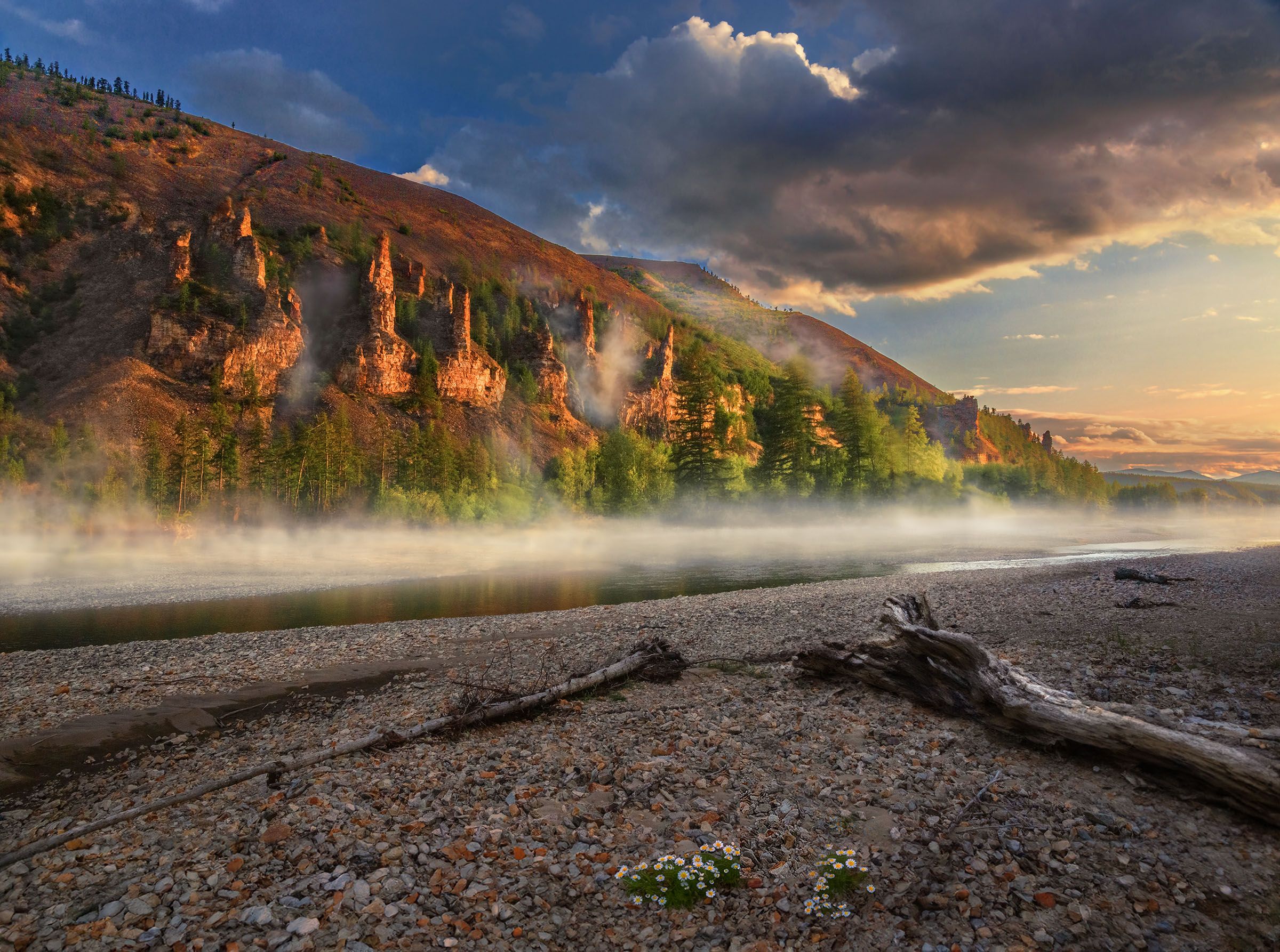 После обеда спрыснул сильный, но короткий дождь. Мы просидели в палатке с полчаса, потом ходили по берегу и вдыхали посвежевшие запахи лиственничной тайги. Уже к вечеру потянуло туманы вдоль реки, местами они поднимались на между скал на сопку. Я нашел среди коряг ромашки и сделал снимок со скальными столбами. Чудесный колымский июльский теплый вечер вдали от цивилизации...