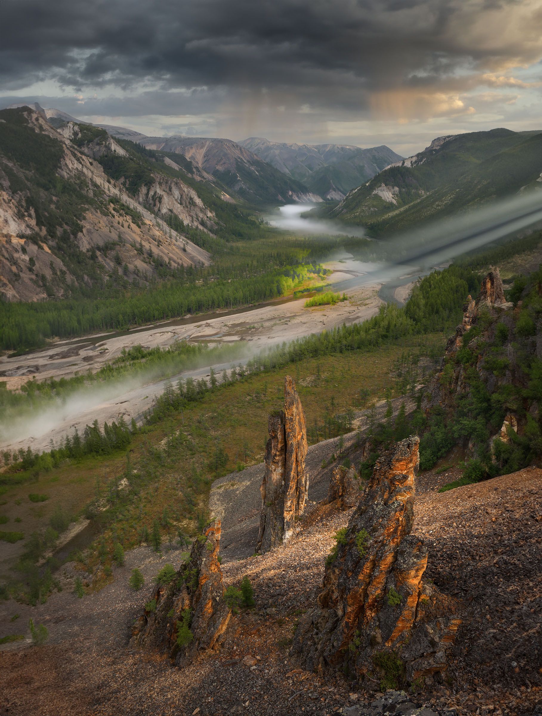 На второй день нашего уютного пребывания прошел короткий теплый сильный дождь, прибив тяжелыми каплями к земле полуденную жару, и ушел вместе с черными тучами в сторону трассы, где застрял среди сопок. Капли дождя громко хлопали по реке, и пузырились. Где-то в глубине моего подсознания появилась грусть по исчезновшему солнечному дню, и в тоже время появилась слабая радость от после дождевых чудных запахов лиственничной тайги, которая имеет множественные хвойные ароматы. Потянулись играющие туманы вдоль реки. Я забрался на склон и смотрел на удивительной красоты колымские пейзажи. Сделал несколько снимков вдоль реки, против течения. Брызнул луч сквозь дыру в облаках, накрывших нас, высветив лес на противоположной стороне реки. Тучи местами они были тонки, и солнечный свет хоть и слабо, мягко и пластично проникал, и немного краснил скалистые остроконечные столбы.