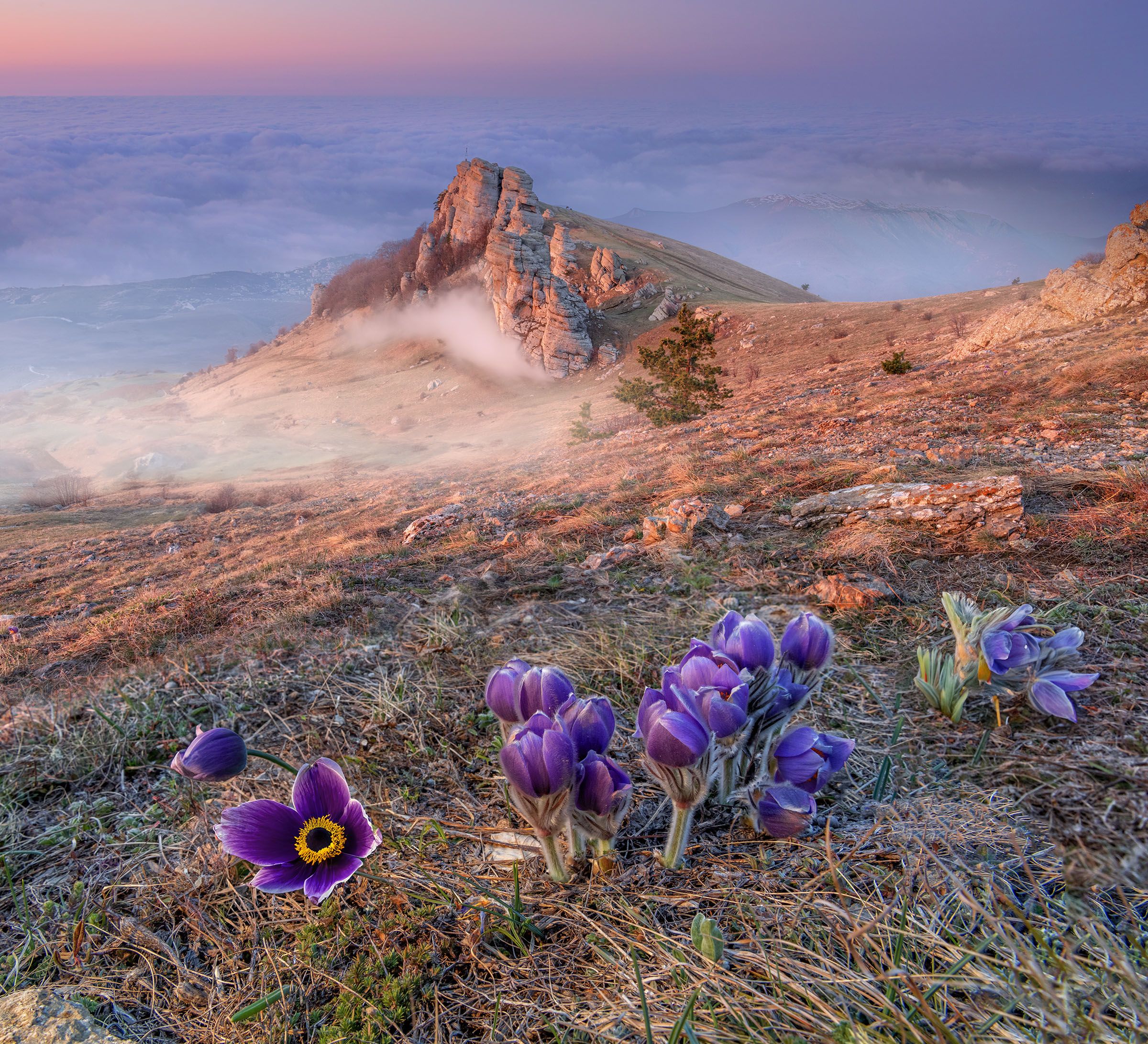 Опять Крым. Сон-трава на Демерджи. Демерджи (Долина Привидений) – это скальная гряда с живописными каменными столбами, грибами, пальцами, колоннами, шарами сложенная в основном из известняков. Самая большая колонна пятиметровой ширины и высотой почти 25 метров. Почему – Долина Привидений? Потому что осенью, в основном, осенью здесь среди скальной стены, состоящей от самого низа до самого верха, а это около семисот метров, из разных скальных чудес типа столбов, гуляют морские туманы. Создаются удивительнейшие замысловатые картины. Вторых таких в России нет. Весной тоже морские туманы бывают, но реже. Морской туман – правильно называть вынос, это туман, образующийся над морем и ветром гонимый на берег. Он может быть днем, утром, вечером, ночью. Осенью он обычно накатывает до четырех раз. Демерджи находится рядом с Алуштой. Здесь две вершины – Южная Демерджи и Северная. В основном посещается Южная Демерджи. Если смотреть на скалы, то ниже тумана, скустившегося у скал, видна тропа. По ней туристы ходят вверх и вниз. На снимке Южная Демерджи, она лицом к морю. Под Демерджи находится поселок Лучистое. Лучистое находится на высоте 490 метров, Южная Демерджи на высоте 1239 метров. Разница 749 метров. Столько нужно преодолеть туристу по высоте, чтобы подняться на Демерджи. Учитывая, что средина Демерджи еще выше, то еще надо подняться метров тридцать. Для молодых людей это сложно, но вполне выполнимо. Людям старше пятидесяти лет такую высоту преодолеть очень сложно, практически не выполнимо. Тем более фототуристам, которым надо нести с собой фотоаппаратуру. Мы поднимаемся на машине. Подъем даже для него очень тяжелый, но четырех человек он завозит сразу. Есть такие возможности. Чем хороша Демерджи в апреле – цветет сон-трава. Причем можно снимать на четыре стороны. На рассвете против солнца, я такой снимок публиковал несколько дней назад; с видами на Южную Демерджи – это вот этот снимок. Вдали виден морской туман. С видами на долину Привидений. Опубликую поздней. Тут одним днем не обойтись, будем два дня. Придется с палатками. Палатки, спальники, коврики я дам. В апреле сон-трава, тюльпаны и пионы. Причем пионы разных видов. Поздней тоже опубликую снимки с ними.