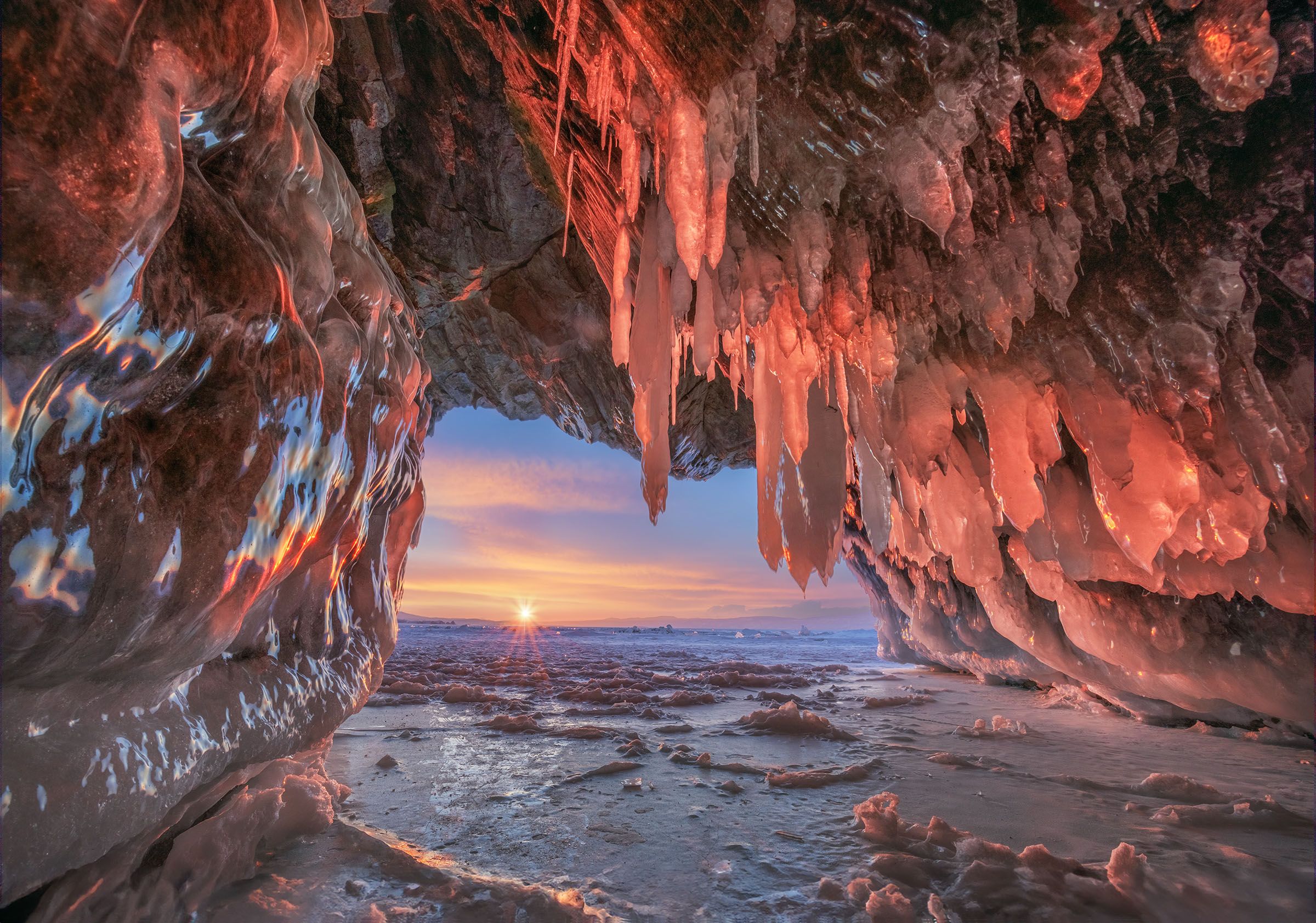 На снимке одна из пещер на закате, где я проводил в разные годы фотосъемки. Ледяные стены в пещере сияют разноцветными огнями, сосули горят красно-пурпурными перевернутыми свечами-сталактитами.