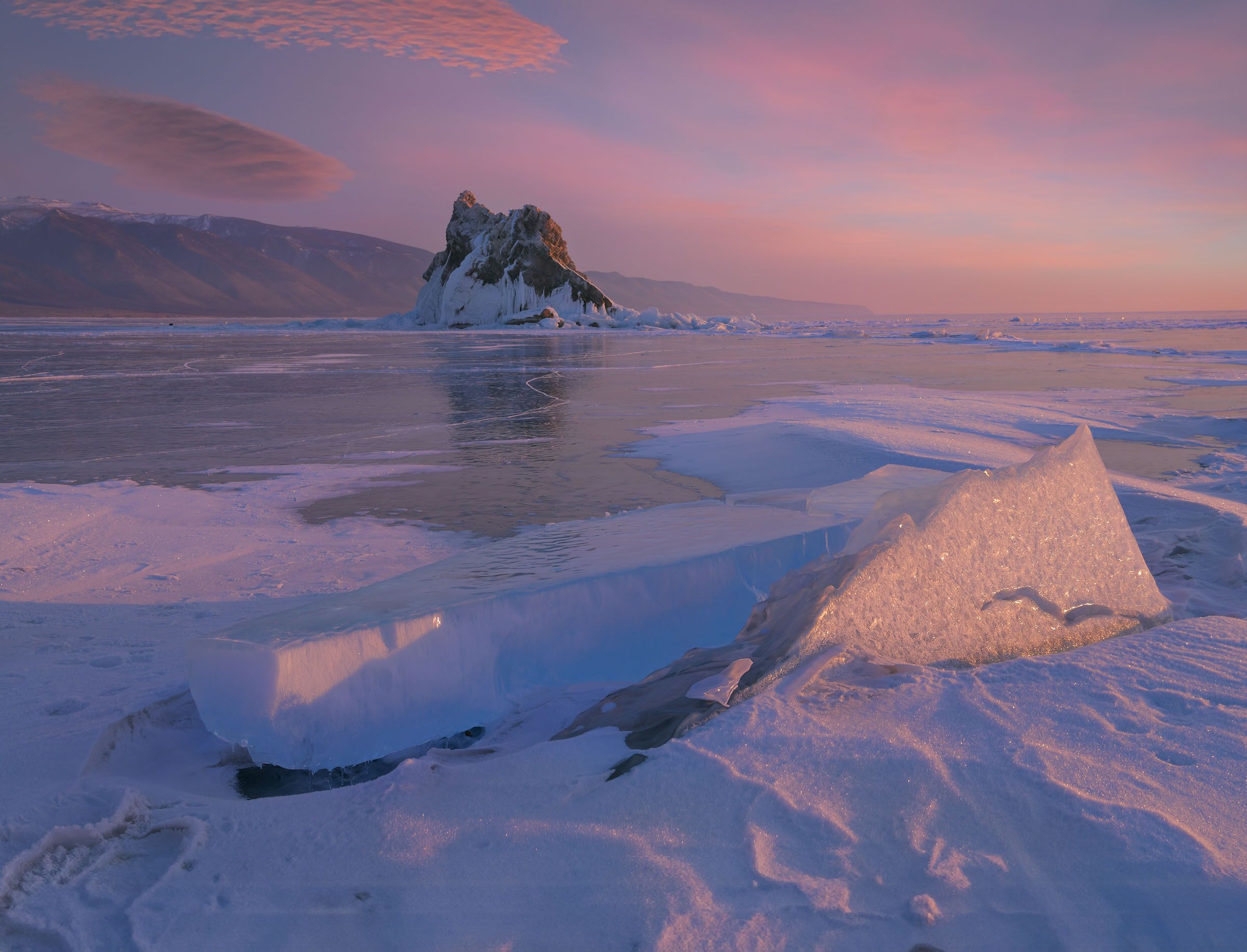 На снимке розовый восход. Первое марта. В начале марта лед на Байкале синеет, становится с голубизной, а в январе, феврале он темный с прозеленью. Со мной была группа китайцев из Гонконга, им так понравилось на Еленке, что мы договорились с водителем на ночные фотосъемки с островом. Ребята хотели сфотографировать ночные пейзажи с островом и звездным ночным небом, что им и удалось с успехом.